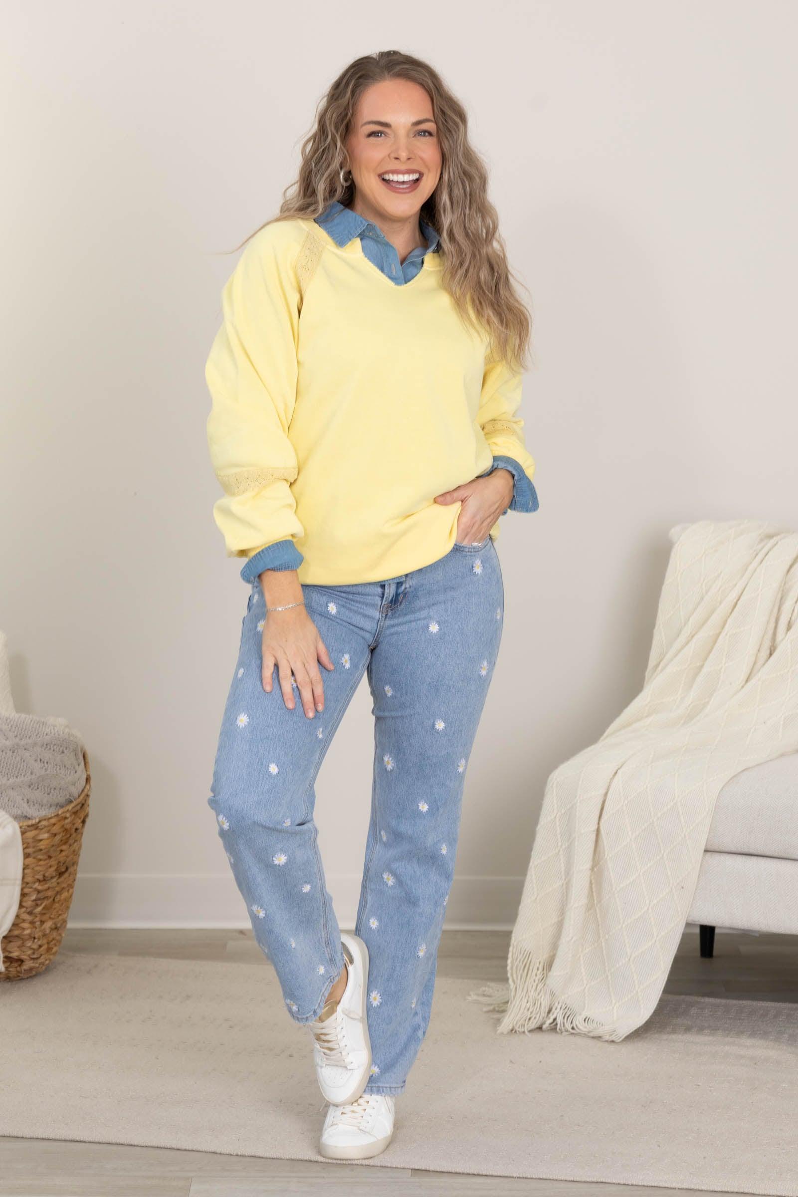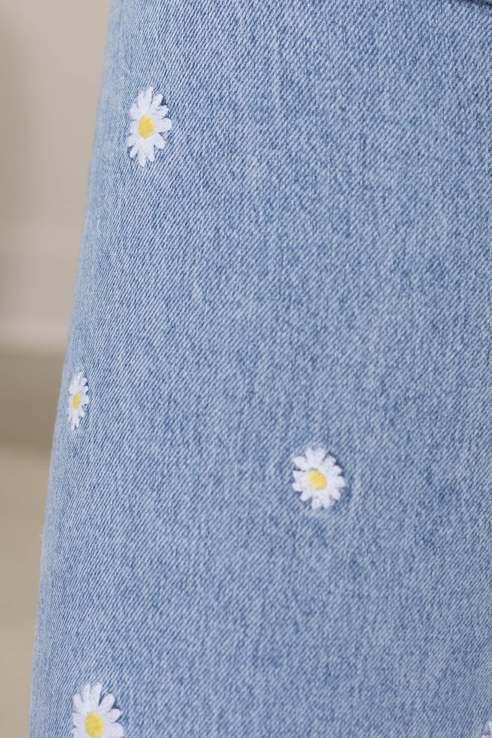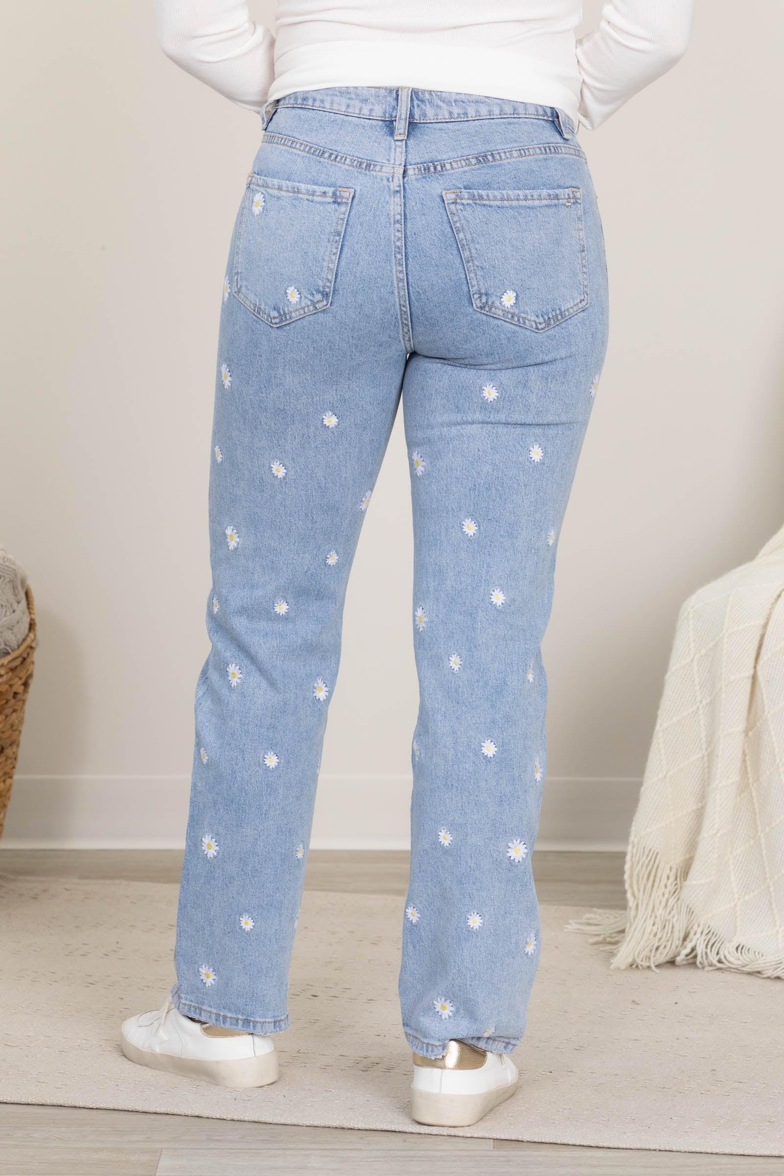 Details: Style: Straight Rise: High Rise Hemline: Finished Waist: Button, Zipper, Belt Loops Color/Wash: Light Wash, Daisy Flowers Brand: Mica Garment Measurements: 24/0 Rise: 10" Inseam: 30" 25/1 Rise: 10" Inseam: 30" 26/3 Rise: 10.5" Inseam: 30" 27/5 Rise: 10.5" Inseam: 30" 28/7 Rise: 11" Inseam: 30" 29/9 Rise: 11" Inseam: 30" 30/11 Rise: 11.5" Inseam: 30" 31/13 Rise: 12" Inseam: 30" 32/15 Rise: 12" Inseam: 30" Erica is 5'7 and wearing her true size 5/27 Our Team Size Recommendation: Fabric: 70% Cotton, 29% Tencel, 1% Spandex Care: Machine Wash Cold + Tumble Dry Low