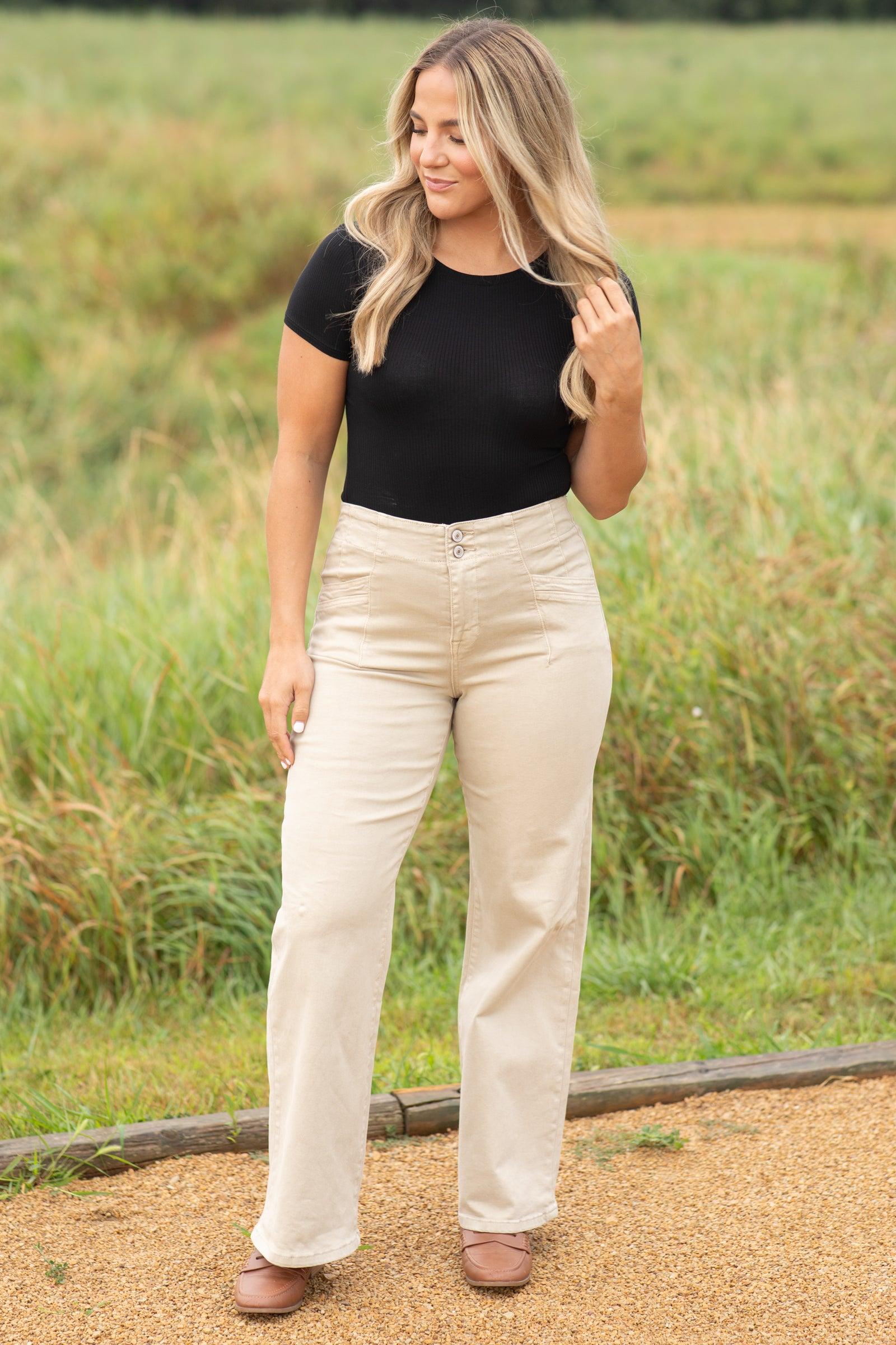 Product Details Wash/Color: Khaki Rise: High Rise Style: Wide Leg Material and Care: 98% Cotton 2% Spandex Machine Wash Cold Tumble Dry Low Size and Fit 24=0 Rise: 10.5" Inseam: 30.5" 25=1 Rise: 11" Inseam: 30.5" 26=3 Rise: 11" Inseam: 30.5" 27=5 Rise: 11" Inseam: 30.5" 28=7 Rise: 11.5" Inseam: 30.5" 29=9 Rise: 11.5" Inseam: 30.5" 30=11 Rise: 12" Inseam: 30.5" 31=13 Rise: 12.5" Inseam: 30.5" 32=15 Rise: 12.5" Inseam: 30.5" Photo model is 5'4 and wearing a size 25 Photo model is 5'7 and wearing a size 27 Video model is 5’8 and wearing size 25