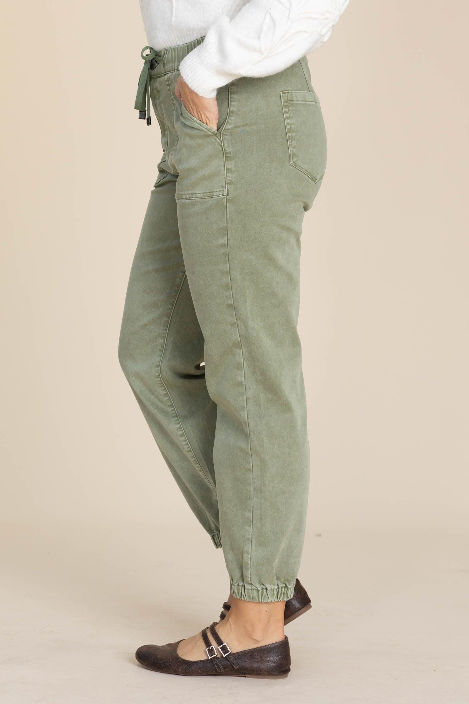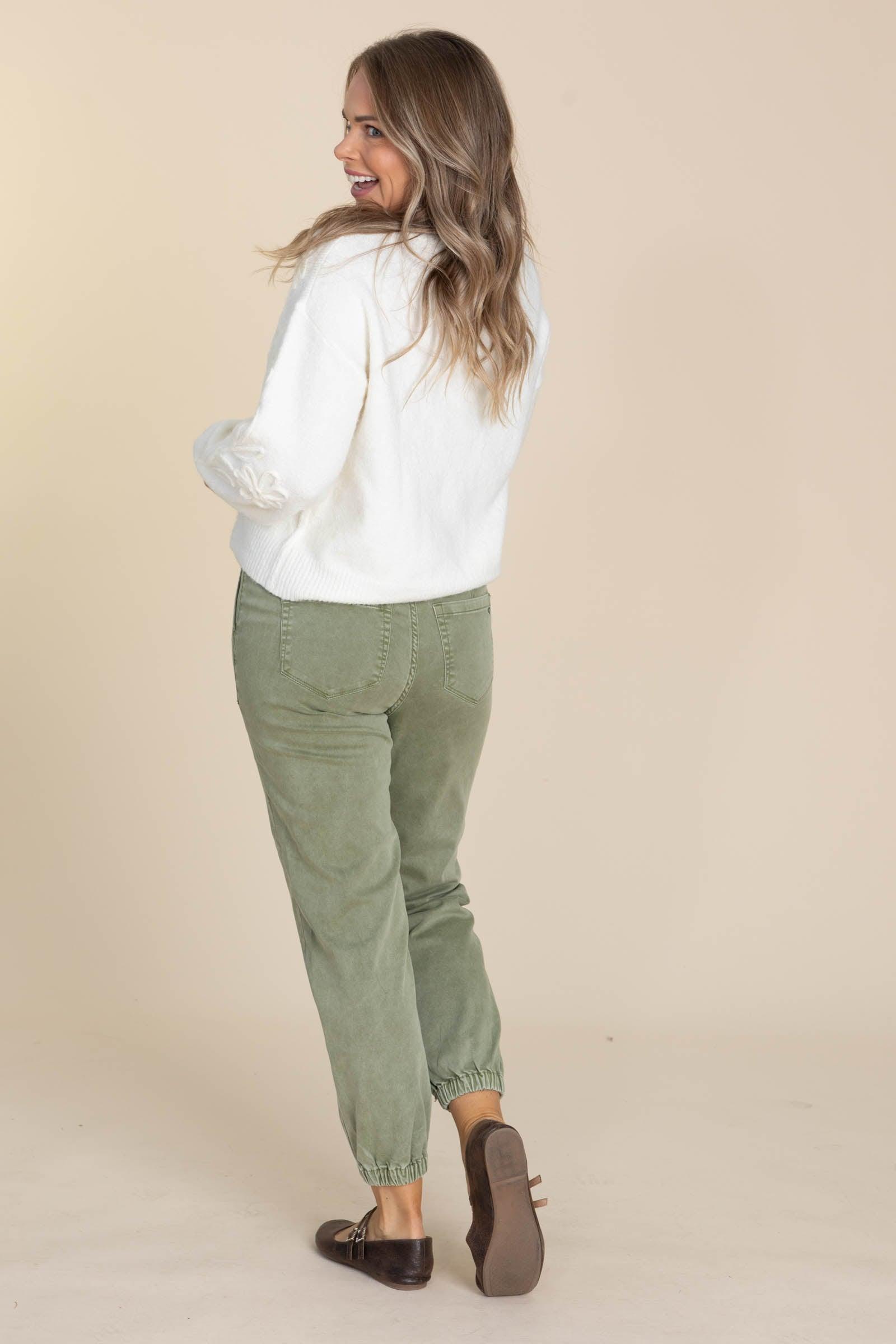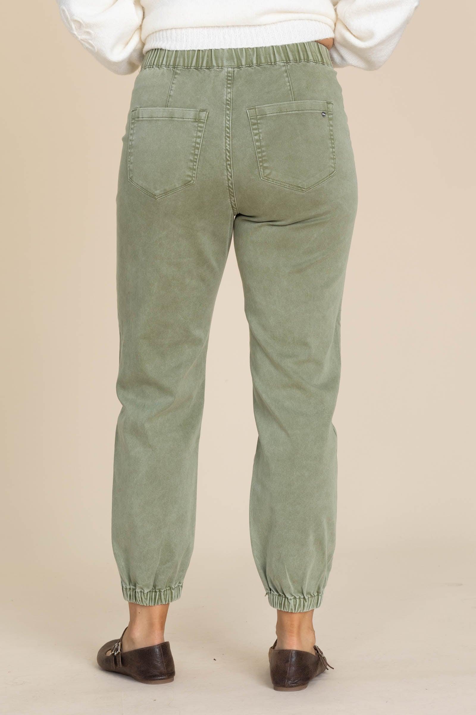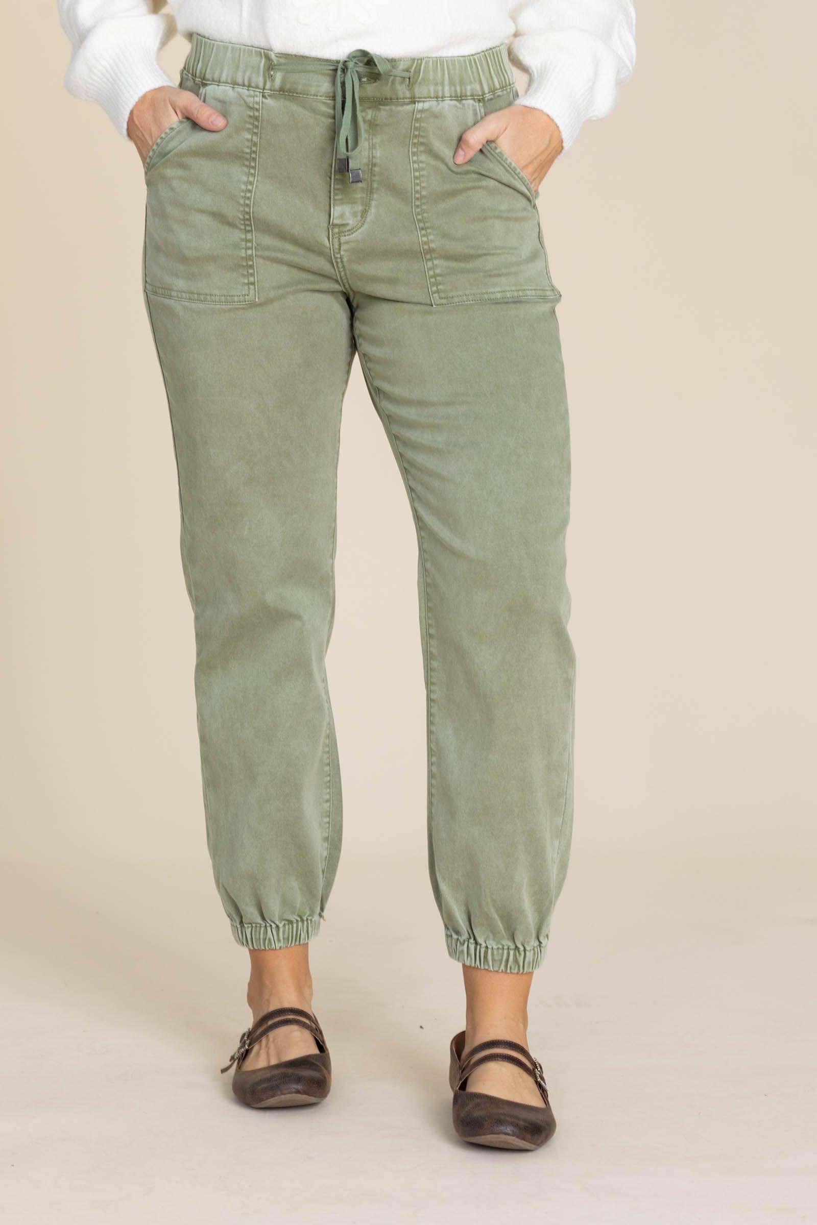 Product Details Colors: Olive Style: Cropped Joggers Brand: Mica Material and Care 68% Cotton 30% Polyester 2% Spandex Machine Wash Cold Tumble Dry Low Size and Fit Small: Waist 28" Rise 11" Inseam 26.5" Medium: Waist 30" Rise 11" Inseam 26.5" Large: Waist 32" Rise 11.5" Inseam 26.5" X Large: Waist 34" Rise 12" Inseam 26.5" Erica is 5’7” and wearing her true size medium
