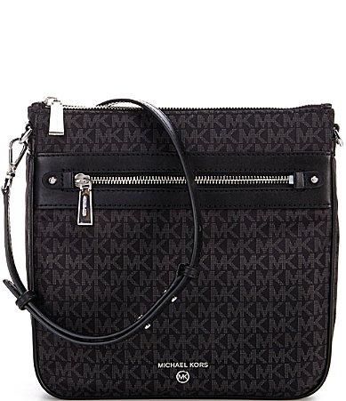 From Michael Kors, the Jet Set Black Signature Logo Charm Large South Crossbody Bag features: Nylon Zip closureInterior: 1 back zip pocket, 1 front slip pocketsExterior: 1 back snap pocket, 1 front zip pocket Removable, adjustable strap Approx. 9.75 W x 9.25 H x 2.5 D bag; 21 - 23 strap dropApprox. weight 0.75 lb. Imported.