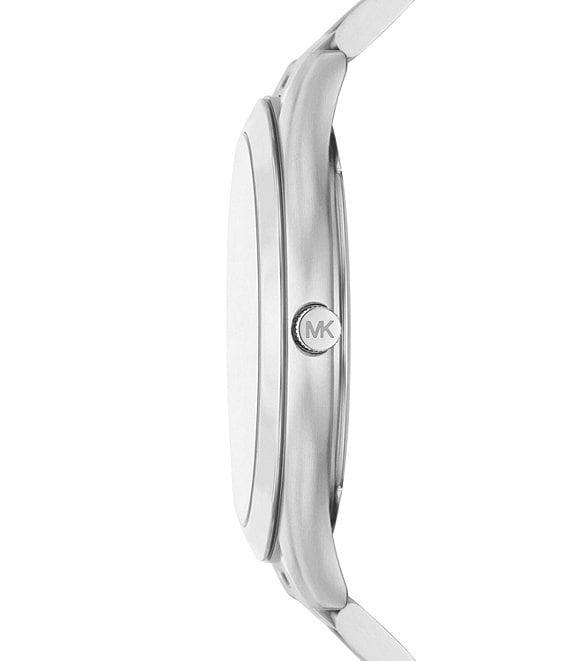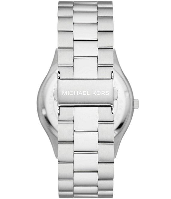 From Michael Kors, the Men's Slim Runway Three-Hand Stainless Steel Bracelet Watch and Luggage Saffiano Leather Wallet Set features: Watch: Silver stainless steel band Blue dial 2 pusher foldover clasp closure Three-hand movement Band width approx. 22mm Case size approx. 44mm Case thickness approx. 10mm Inner Circumference: 200 /- 5mm Water Resistance: 5 ATM Wallet: Genuine embossed leather Imitation leather lining Interior: 1 bill compartment, 6 card slot compartments Bifold silhouette Approx. 4" L x 3.4" W Imported.