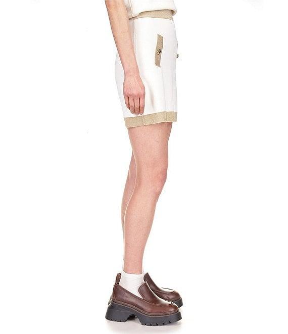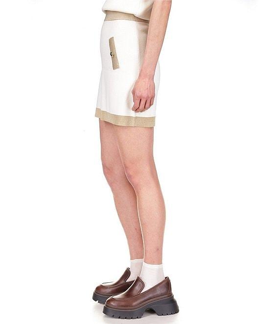 From Michael Kors, this skirt features: Pencil silhouette Non-functional faux welt pockets Gold button detailing Metallic trim Mini length Straight hemline Pull-on construction Approx. 15" length Recycled viscose/nylon/metallic/elastane Machine wash cold separately; wash inside out; gentle cycle; reshape and lay flat to dry; cool iron on the back side if needed Dry clean if necessary Imported.