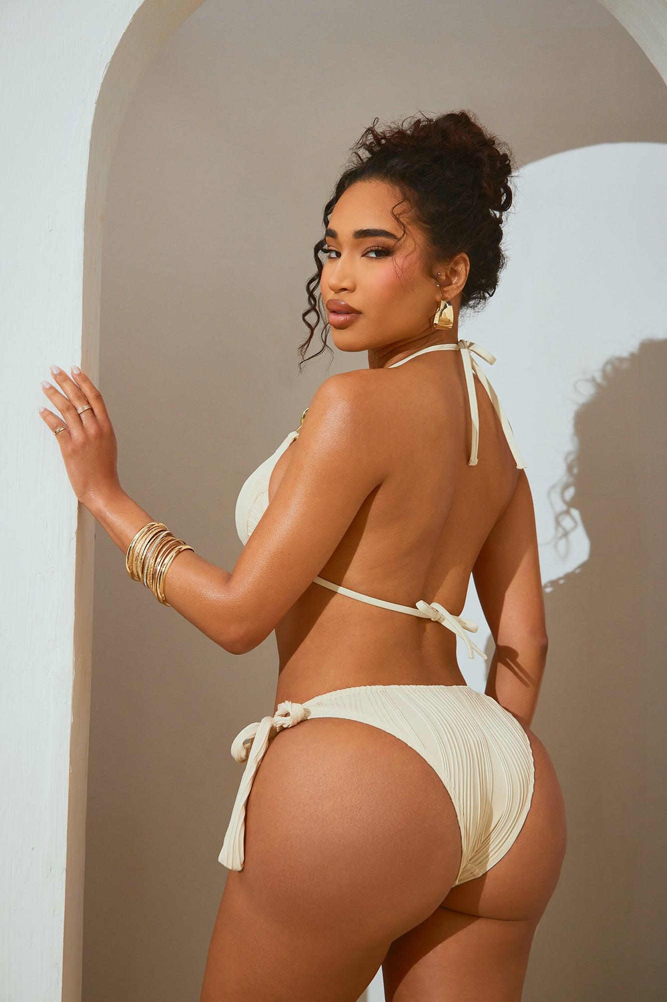 Available In Ivory. 2 Piece Ensemble Bikini Textured Triangle Bikini Top Removable Cups Chain Details Adjustable Tunneled Straps Side Tie Bikini Bottom Ruching Full Stretch Final Sale Shell: 82% Polyester 18% Spandex Lining: 95% Polyester 5% Spandex Imported California Proposition 65WARNING: Cancer and Reproductive Harm - www.P65Warnings.ca.gov.