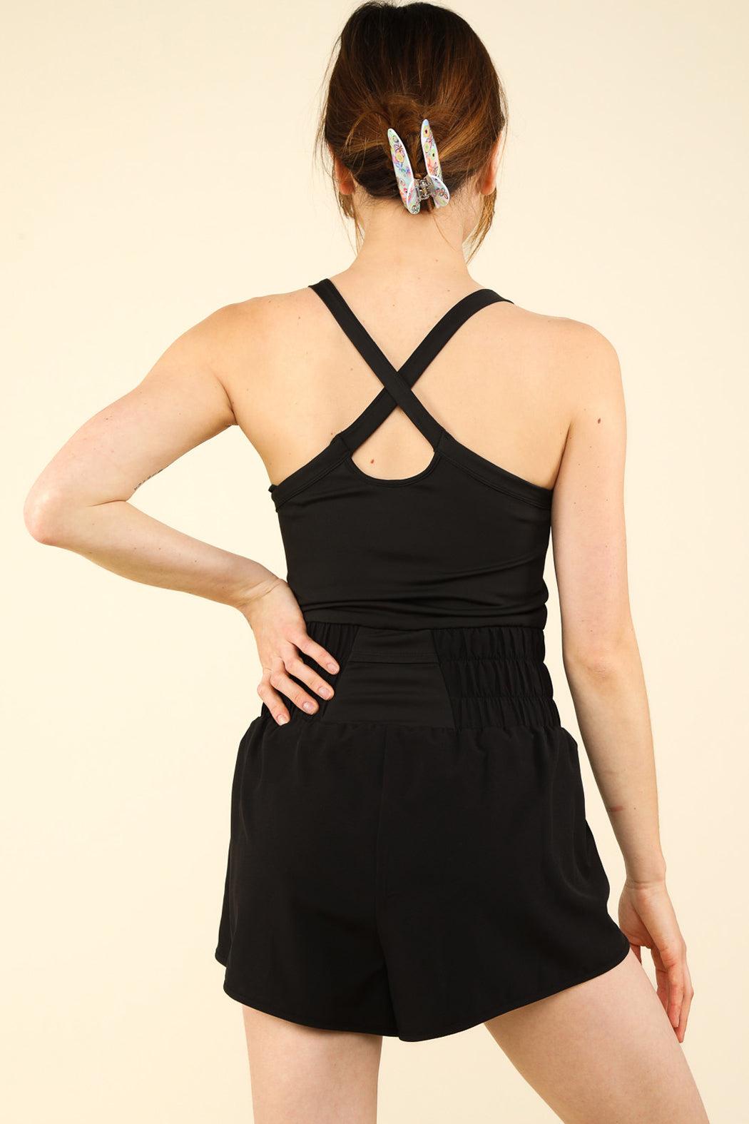 Black active romper with criss crossing back straps, wide elastic waistband, and flowing shorts with underwear lining. Follow @Lunaboutiquecanton on instagram and DM us with any questions :)