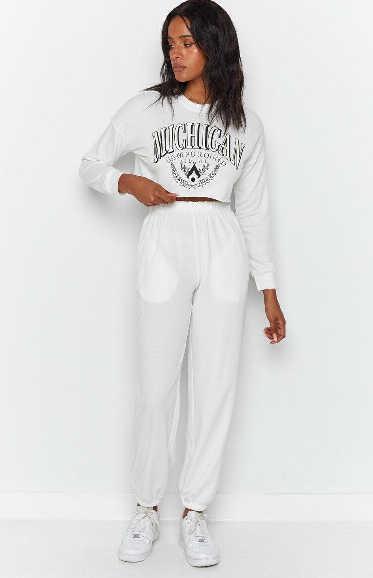 Two-piece Grey Lounge set Top: Grey long sleeve top Long sleeves with drop shoulders Cropped length Graphic 'Michigan' print on the front Lightweight, stretchy fabric Semi-sheer Bottom: Grey track pants Elastic waistline and cuffs Functioning side pockets Lightweight, stretchy fabric Semi-sheer