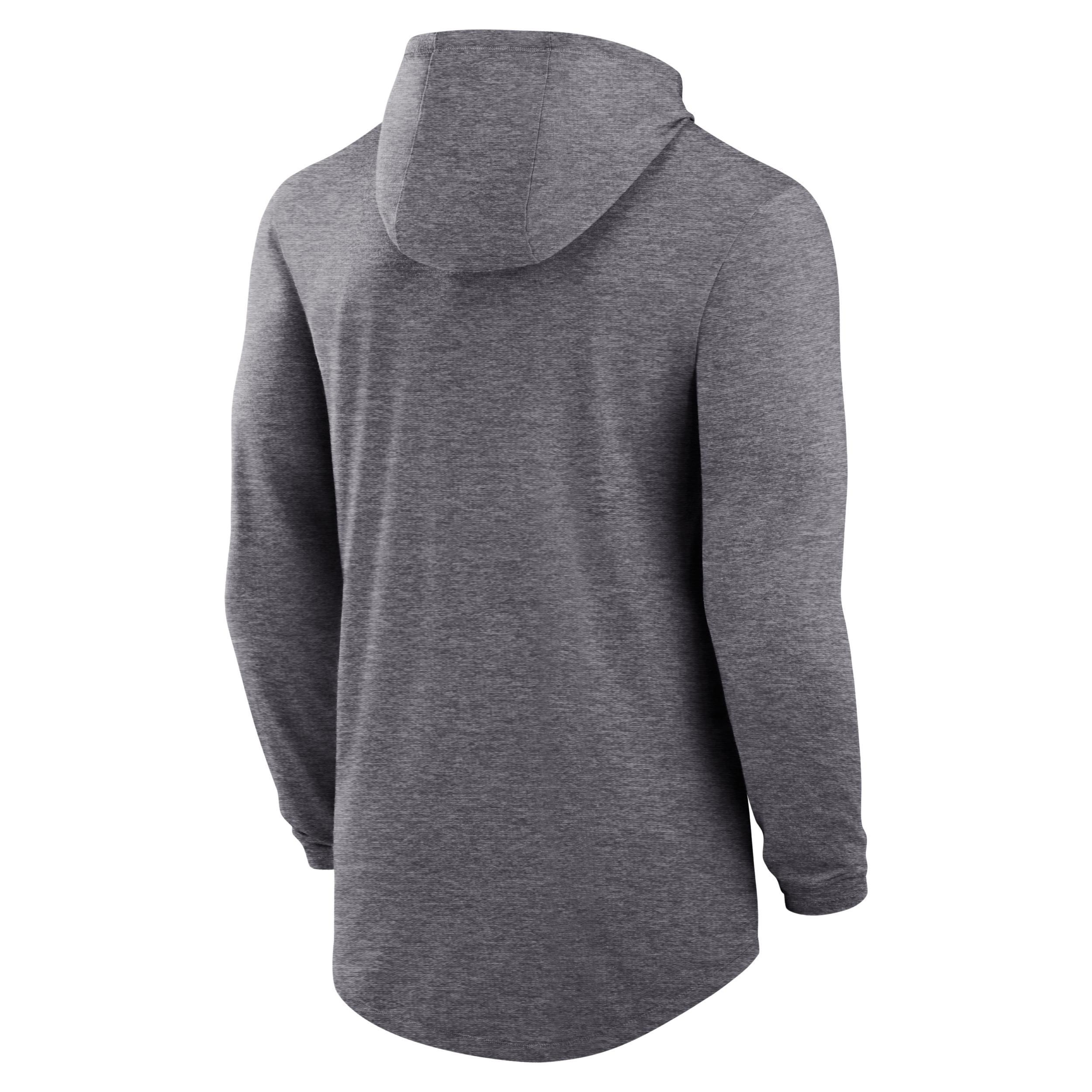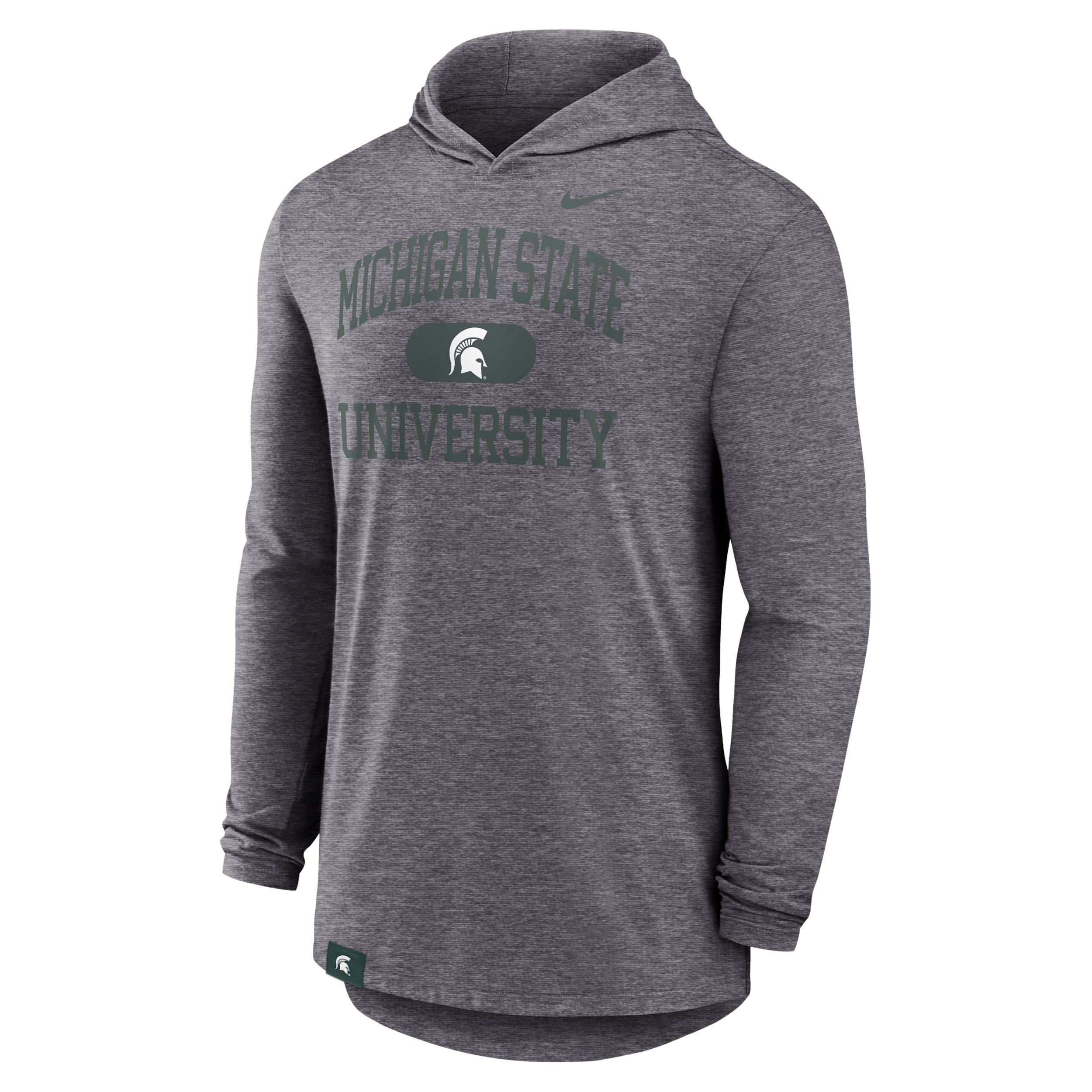The Michigan State Spartans Blitz T-Shirt combines soft, lightweight tri-blend material with sweat-wicking technology to help keep you dry and comfortable. Its heathered design helps accentuate the team graphics across the chest. Benefits:Nike Dri-FIT technology moves sweat away from your skin for quicker evaporation, helping you stay dry and comfortable. Drop-tail hem helps provide proper coverage. Product Details:Hood without drawstring. 75% polyester/13% organic cotton/12% rayon. Machine wash. Imported. Style: CLU24TP01NBVRK; Color: Grey Heather; Size: 3XL; Gender: Male; Age Group: Adult | Michigan State Spartans Blitz Men's Nike Dri-FIT College Long-Sleeve Hooded T-Shirt in Grey, Size: 3XL | CLU24TP01NBVRK-MSU