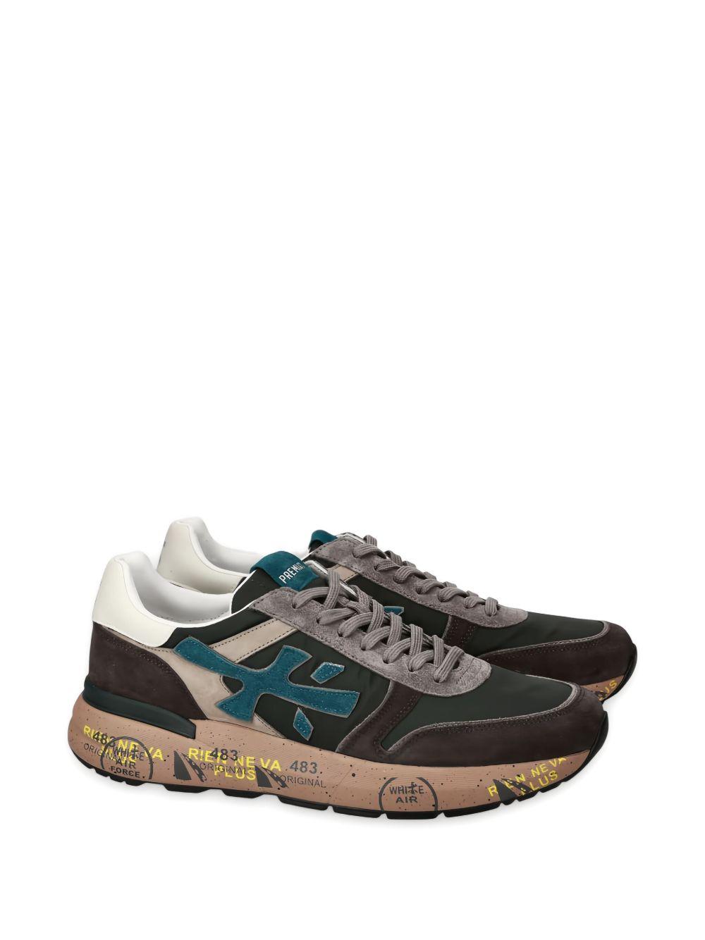 Premiata Mick logo-detail suede sneakers | Grey | grey | suede upper | teal logo detail | rubber sole | graphic print sole | lace-up fastening | Polyamide/Calf Leather/Polyurethane/Goat Skin/Calf Leather/Polyethylene vinyl acetate (PEVA)/Rubber/Thermoplastic Polyurethane (TPU) | Low-Tops | Sneakers | Shoes | Men