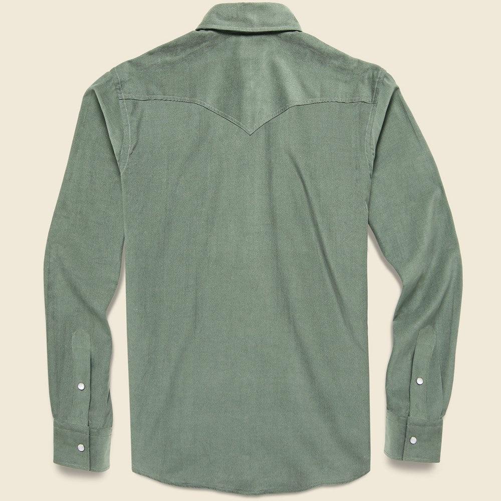 Offering a seasonal twist on an incredible micro-corduroy fabric, this Western Shirt from Hamilton Shirt Co. has a luxurious feel and the right amount of grit for the cold months ahead. Cut a little shorter for casual versatility and finished with authentic Western details like a pearl snap placket and chest pockets, a spread collar, and classic western front and back yokes. Hand-cut and sewn in Houston, TX. Micro-corduroy cotton fabric Classic western shirt silhouette Pearl snapped placket Two patch pockets with flaps and pearl snaps Rounded hem that’s cut a little shorter Western front and back yokes Traditional Western fit that runs true to size We recommend taking your normal size Made in USAMaterials: 100% cotton The following measurements are for size medium: Chest: 45" | Sleeve: 34 ½" | Shoulder: 17“ | Length: 28"