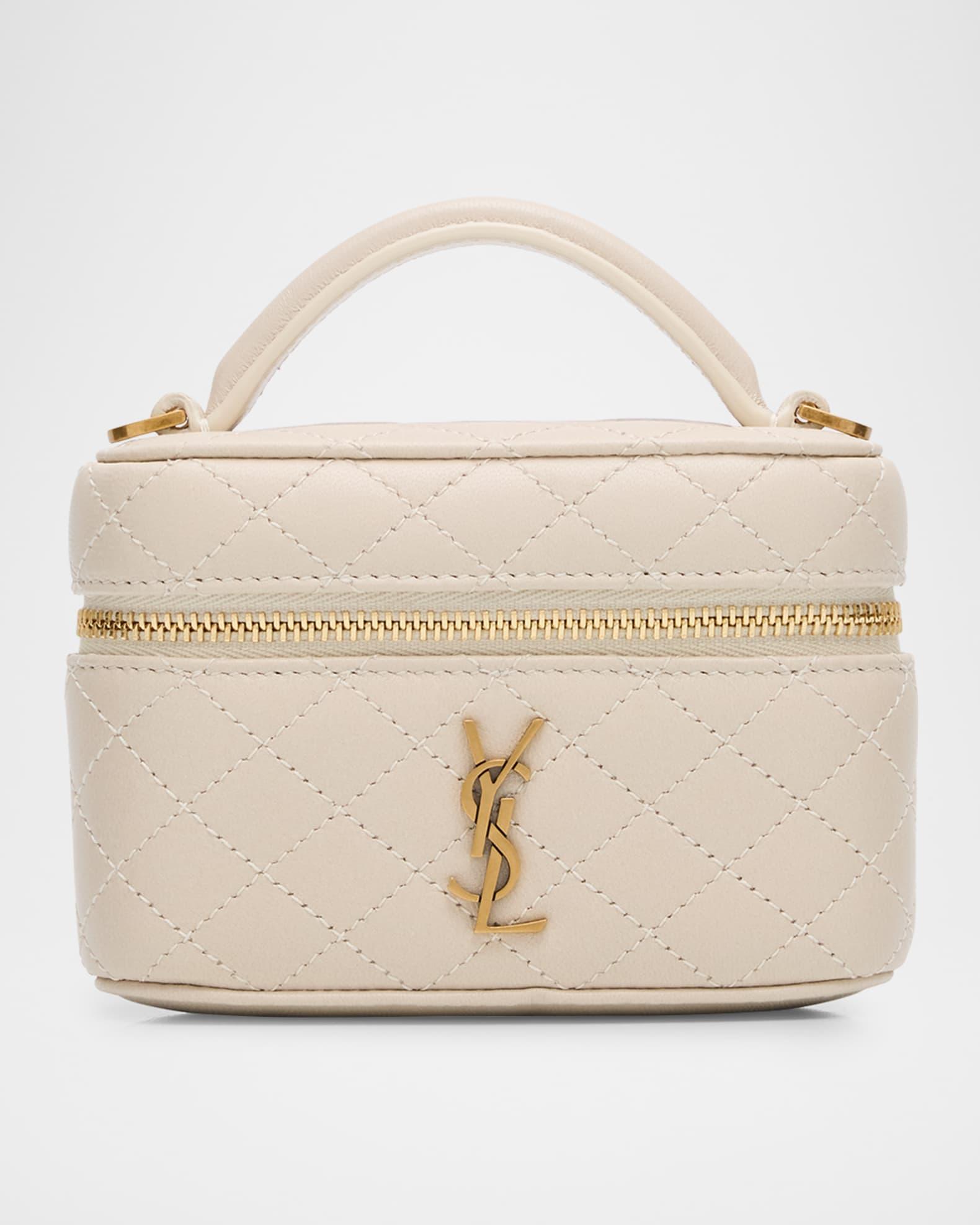 Saint Laurent's vanity top handle bag, crafted in soft quilted leather, offers a sophisticated and stylish silhouette. Top handle Detachable shoulder strap Can be worn as a top handle or shoulder bag Zip top closure Light bronze hardware Approx. 3.1"H x 4.7"W x 1.6"D Made in Italy Proposition 65 warning for California residents