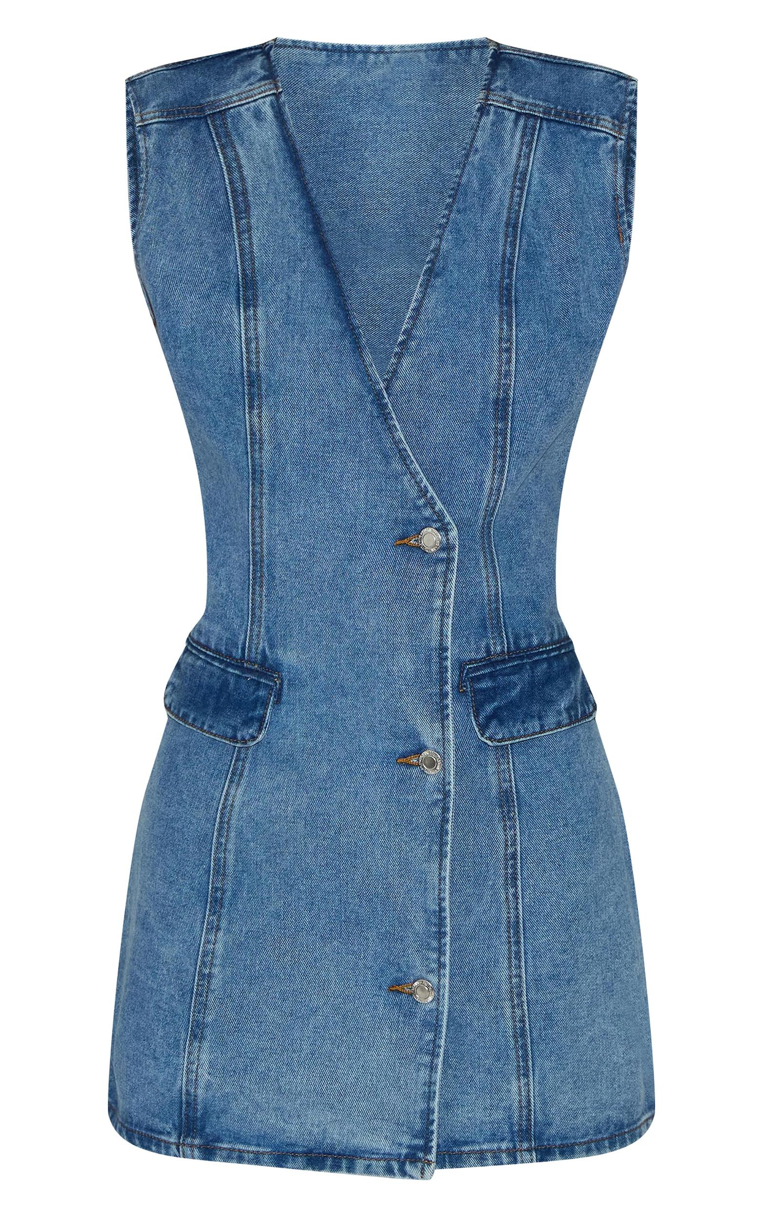 Add retro flair to your wardrobe with the mid blue wash button up vest style denim dress. This structured denim dress features a vest-inspired design with a button-down front and cinched waist. Wear solo with heeled sandals or layer over a mesh top for added edge.Length approx 81.5cm/32inch (Based on sample size US 4)Model wears size UK 8/ EU 36/ AUS 8/ US 4Model Height - 5ft 8inchp]:!mb-4inch>Brand: PrettyLittleThingCategory: DenimProduct type: Denim Day DressColor: Mid Blue WashMaterial: Rigid DenimSleeves: SleevelessOccasion: Day