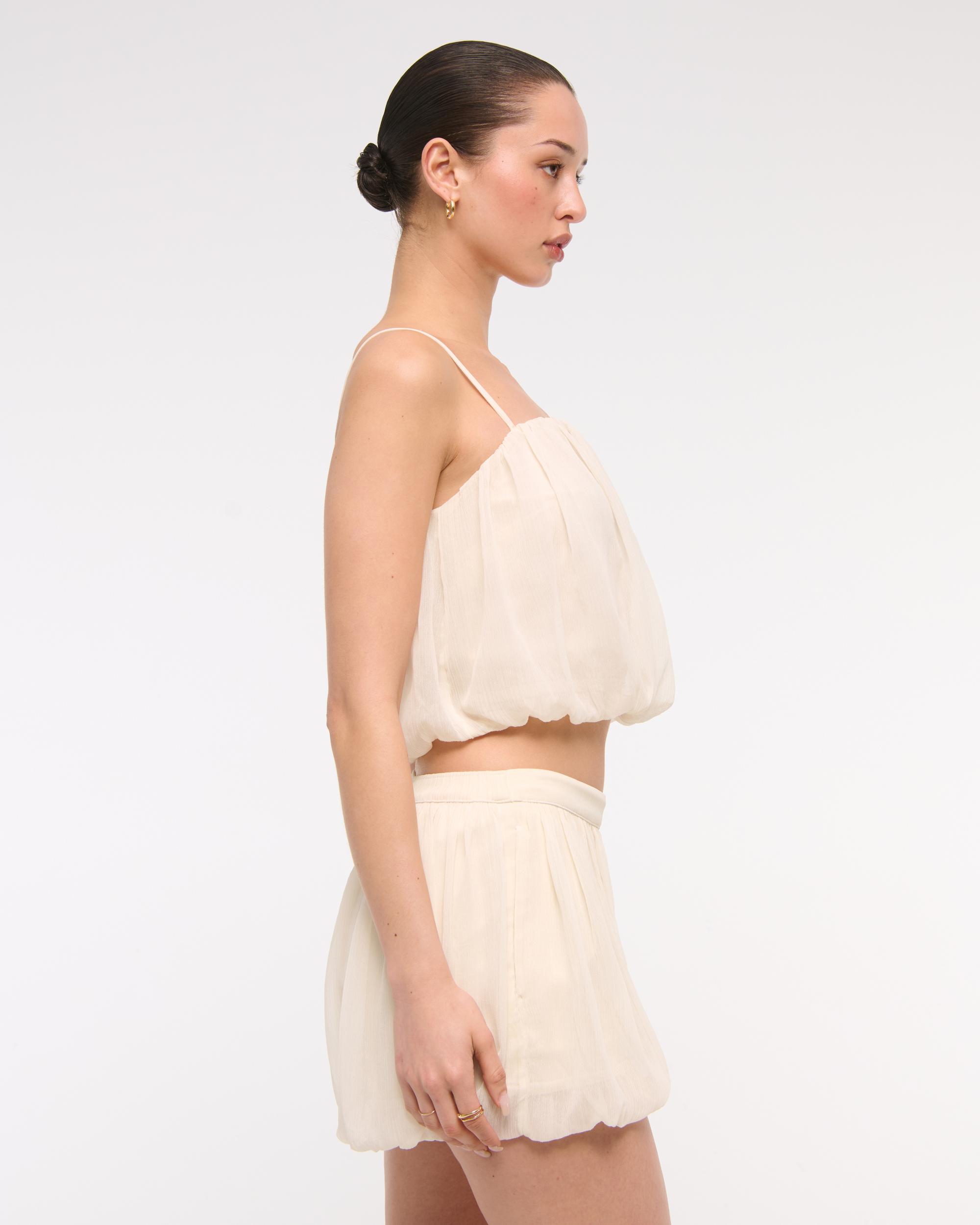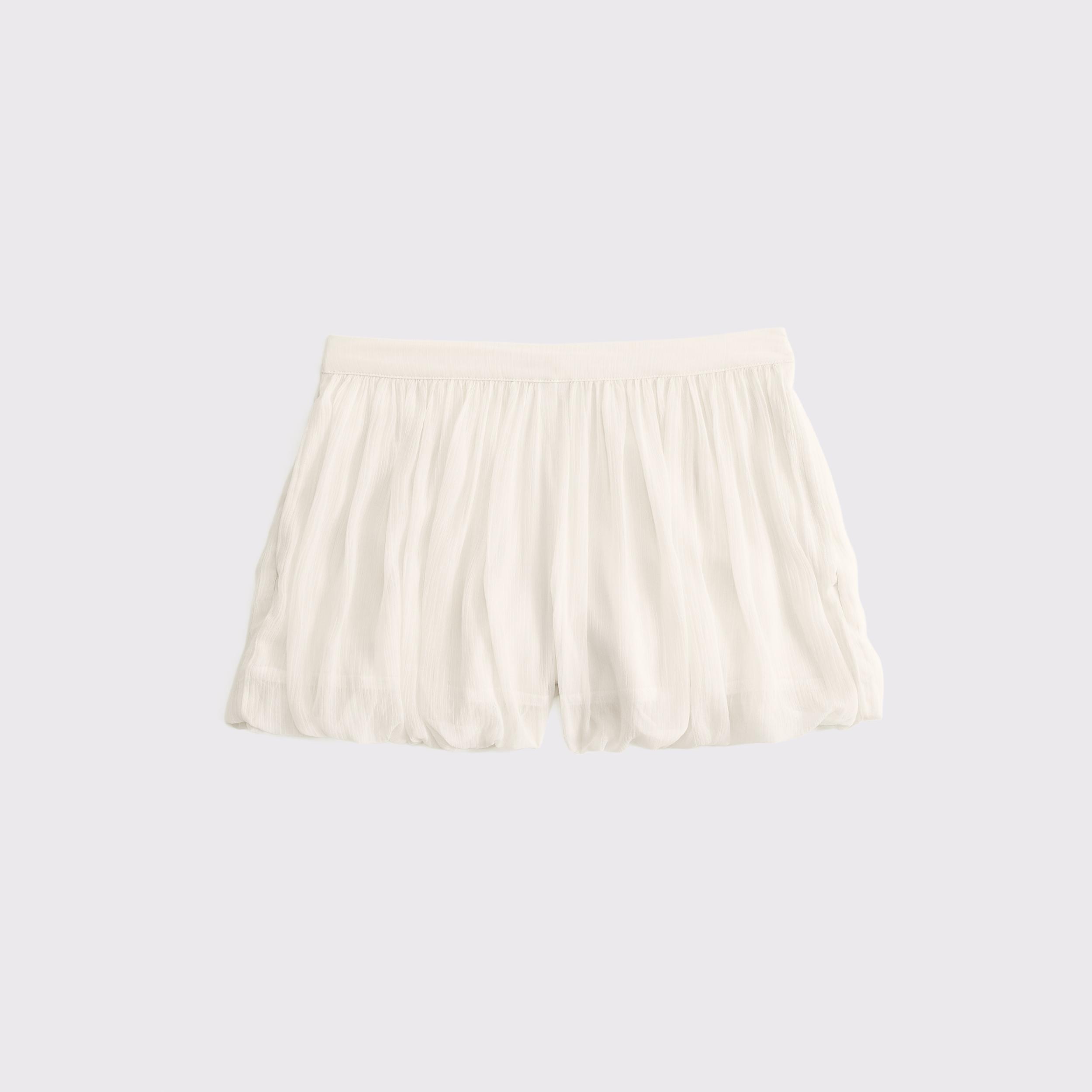 Our new mid rise shorts in our soft woven fabric, featuring a sheer second layer, elasticated pull-on style waistband, pockets and on-trend bubble hem.