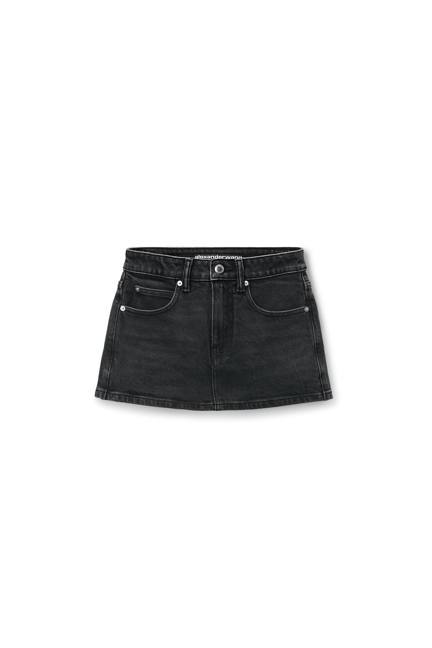 Cut in a slim mid-rise silhouette, this comfortable stretch denim skirt showcases a dark wash. It is finished with a 5-pocket design and a front fly closure.