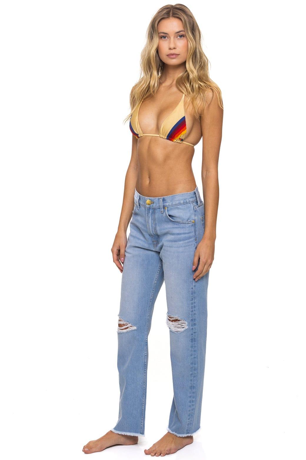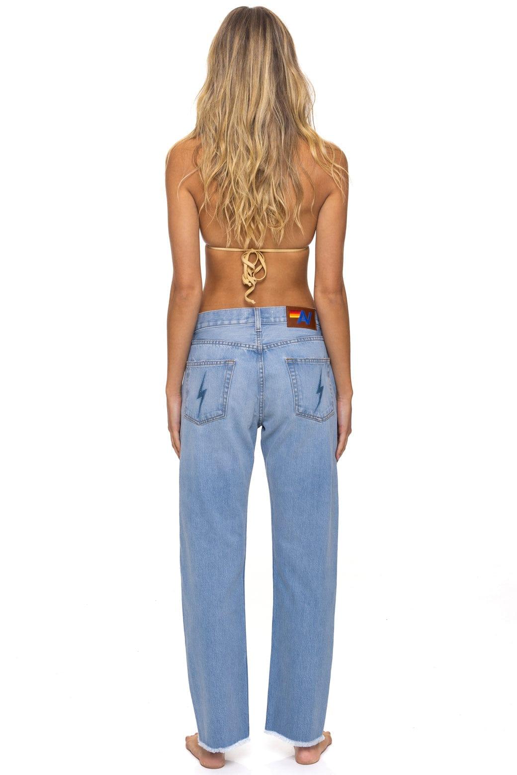 This is the perfect relaxed straight leg fit with a mid rise and ankle-length inseam. Cut from superior soft semi-rigid denim with added laundering to give that perfect broken in feel with fading, ripped knees, and distressed details. Special laundered wash process to give it our personal vintage feel. - 100% Organic Cotton Denim - Handmade in LA with imported materials -Model is wearing a size 25 Measurements: Front Rise - 11 3/4 inches Inseam - 28 inches Leg Opening - 16 1/2 inches