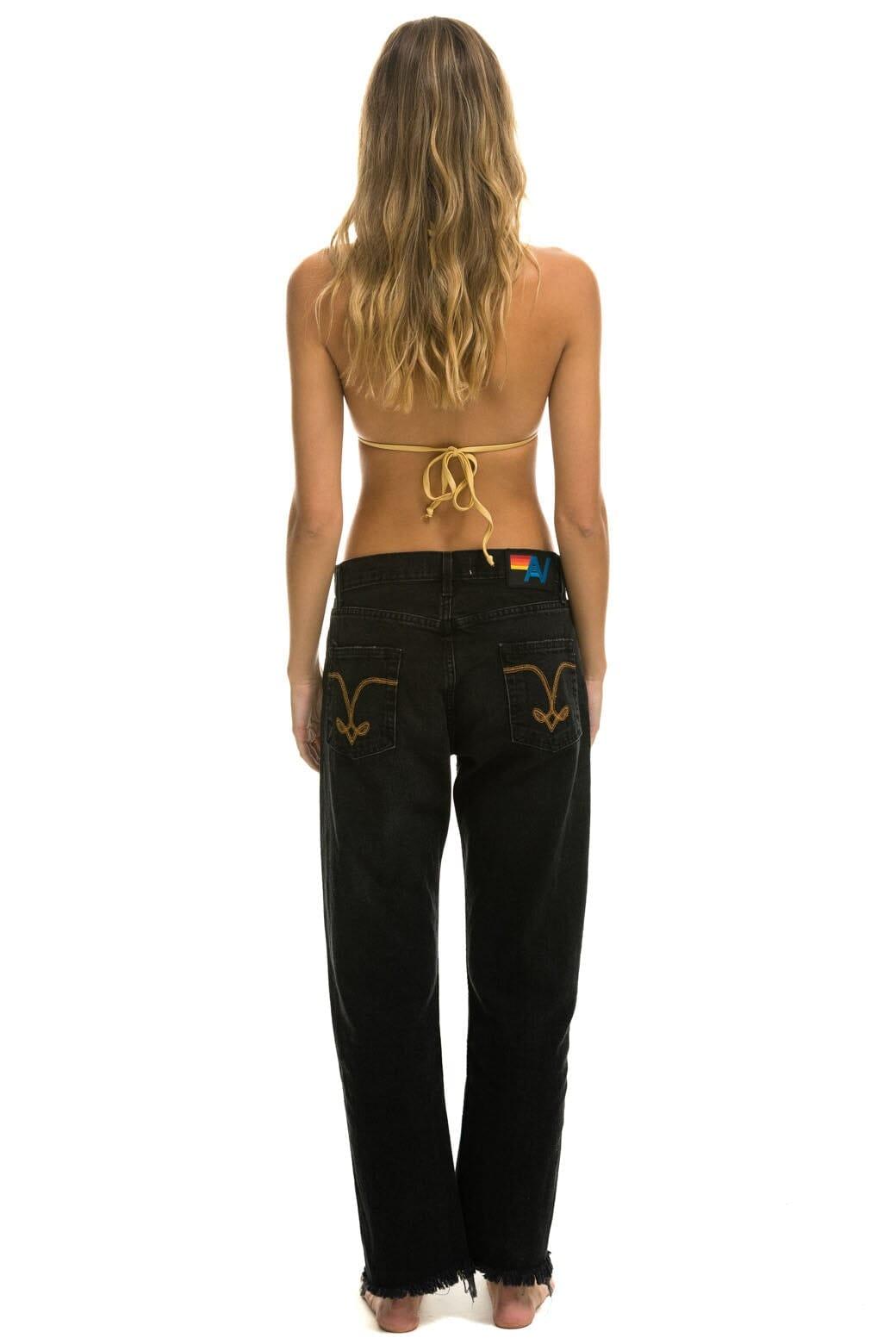 This is the perfect relaxed straight leg fit with a mid rise and ankle-length inseam. Cut from superior soft semi-rigid denim with added laundering to give that perfect broken in feel with fading, ripped knees, and distressed details. Special laundered wash process to give it our personal vintage feel. - 100% Organic Cotton Denim - Handmade in LA with imported materials -Model is wearing a size 25 Measurements: Front Rise - 11 3/4 inches Inseam - 28 inches Leg Opening - 16 1/2 inches