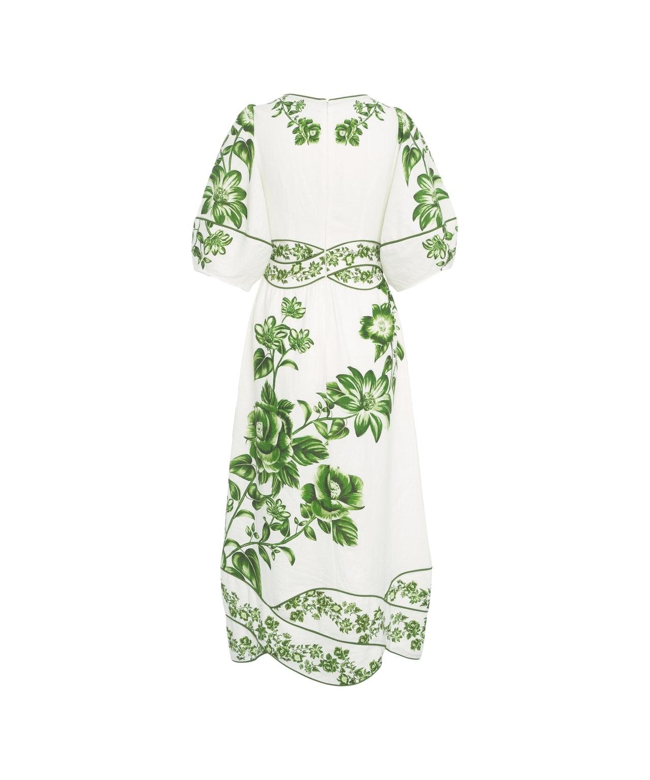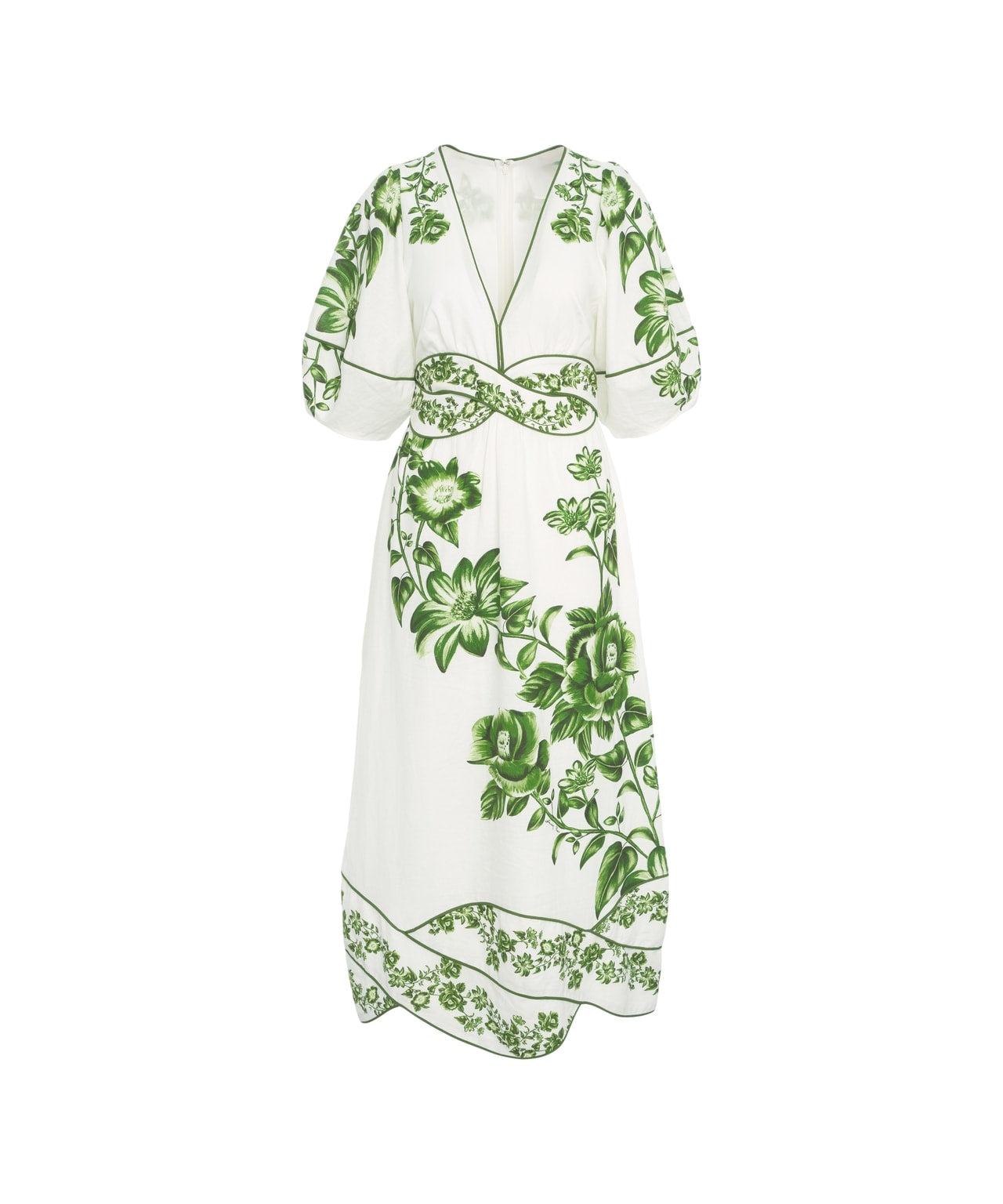 Calf-lengthV-necklineFloral printThree-quarter length sleevesInternal hookWaistbandSlip dressAll-over printBalloon sleevesZipper on the back