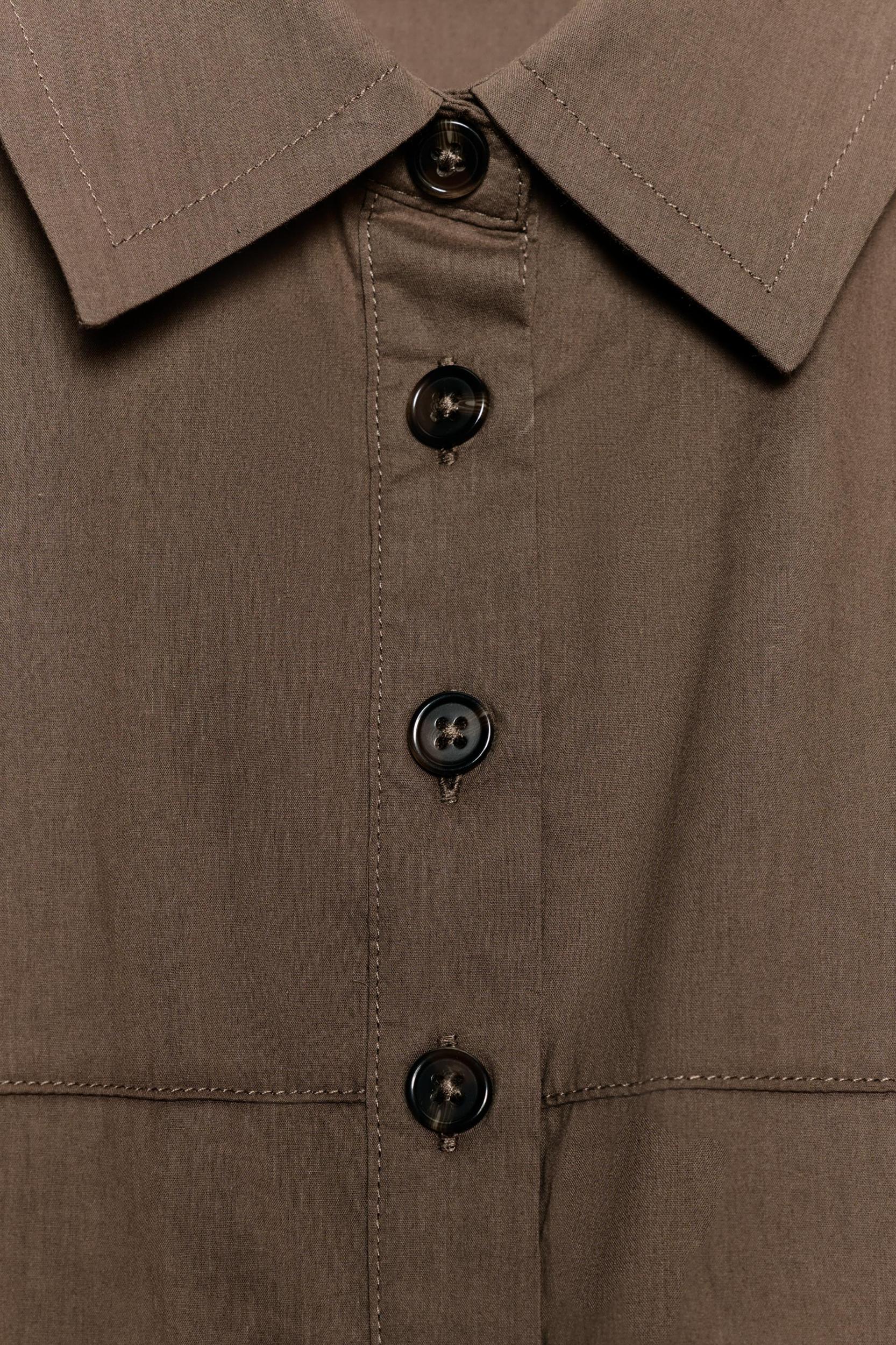 Midi dress with lapel collar and sleeveless design. Front pocket and flap detail. Pleats at hem. Front button closure.