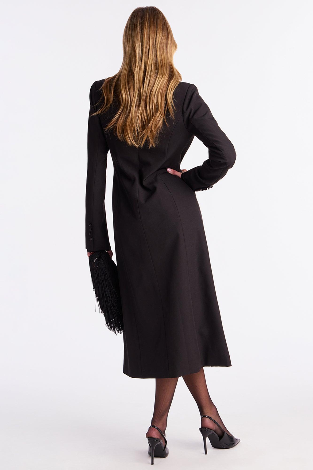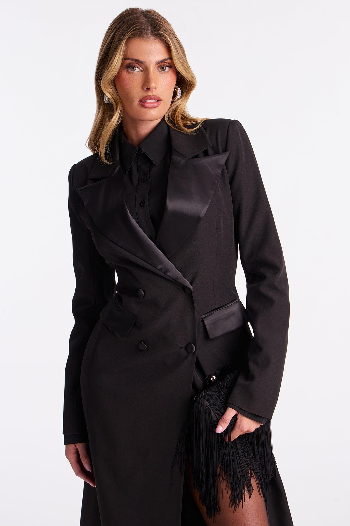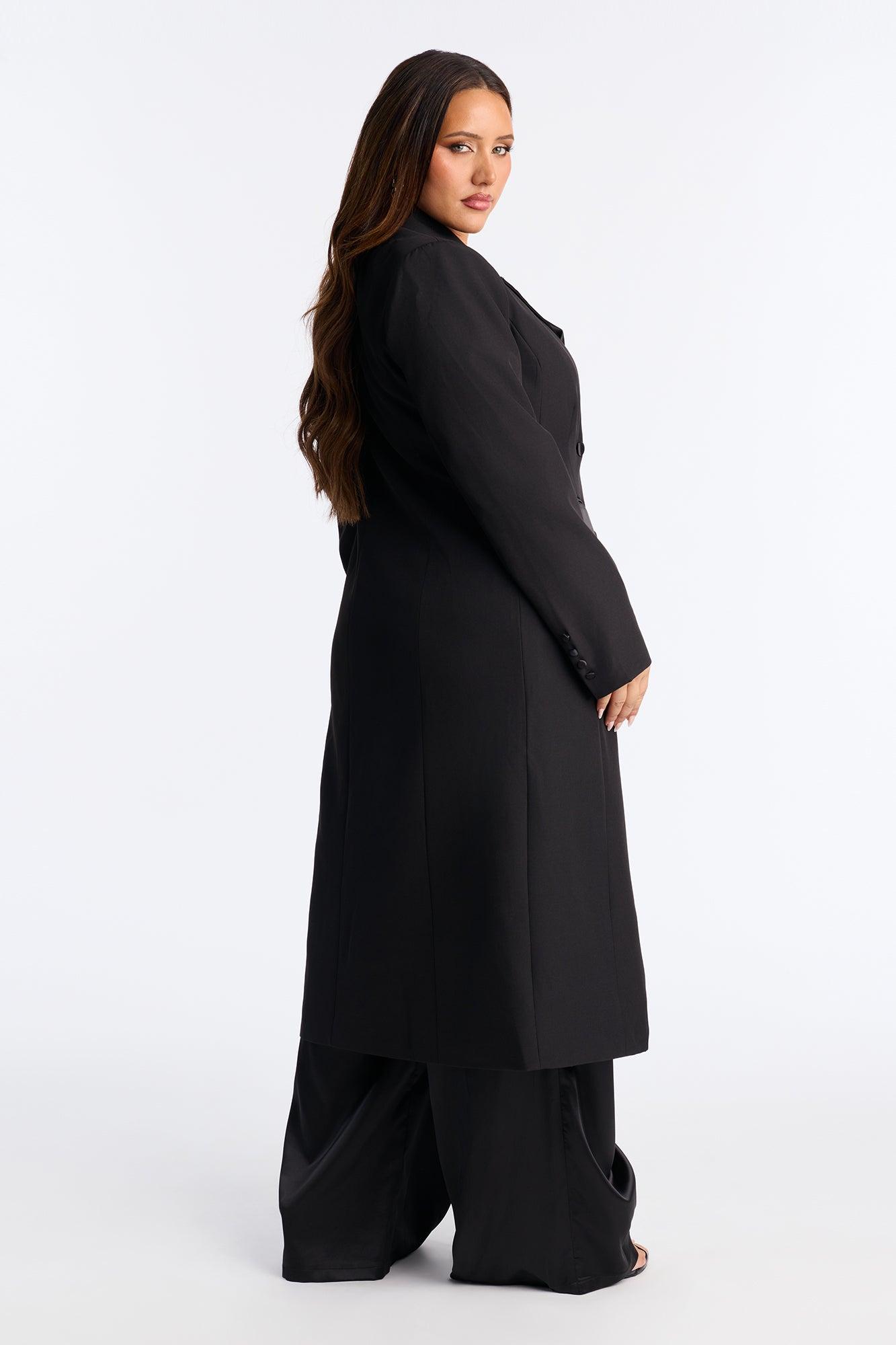 Available In Black And Burgundy. Coat Collar Neckline Long Sleeves Shoulder Pads Double Breasted Satin Contrast Pockets Fully Lined Self: 96% Polyester 4% Spandex Contrast: 92% Polyester 8% Spandex Lining: 100% Polyester Imported California Proposition 65WARNING: Cancer and Reproductive Harm - www.P65Warnings.ca.gov.