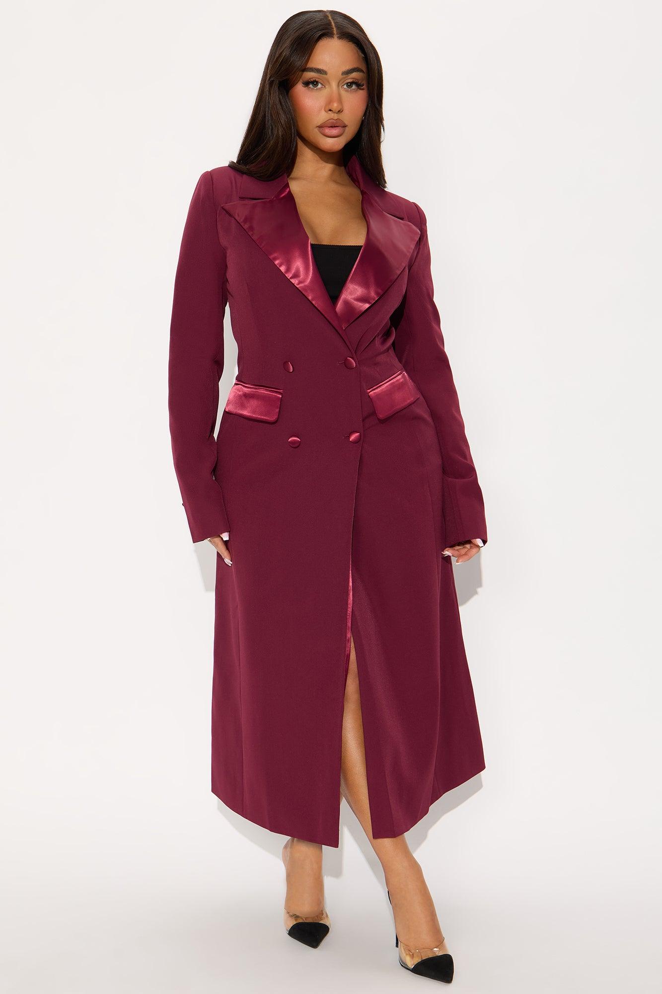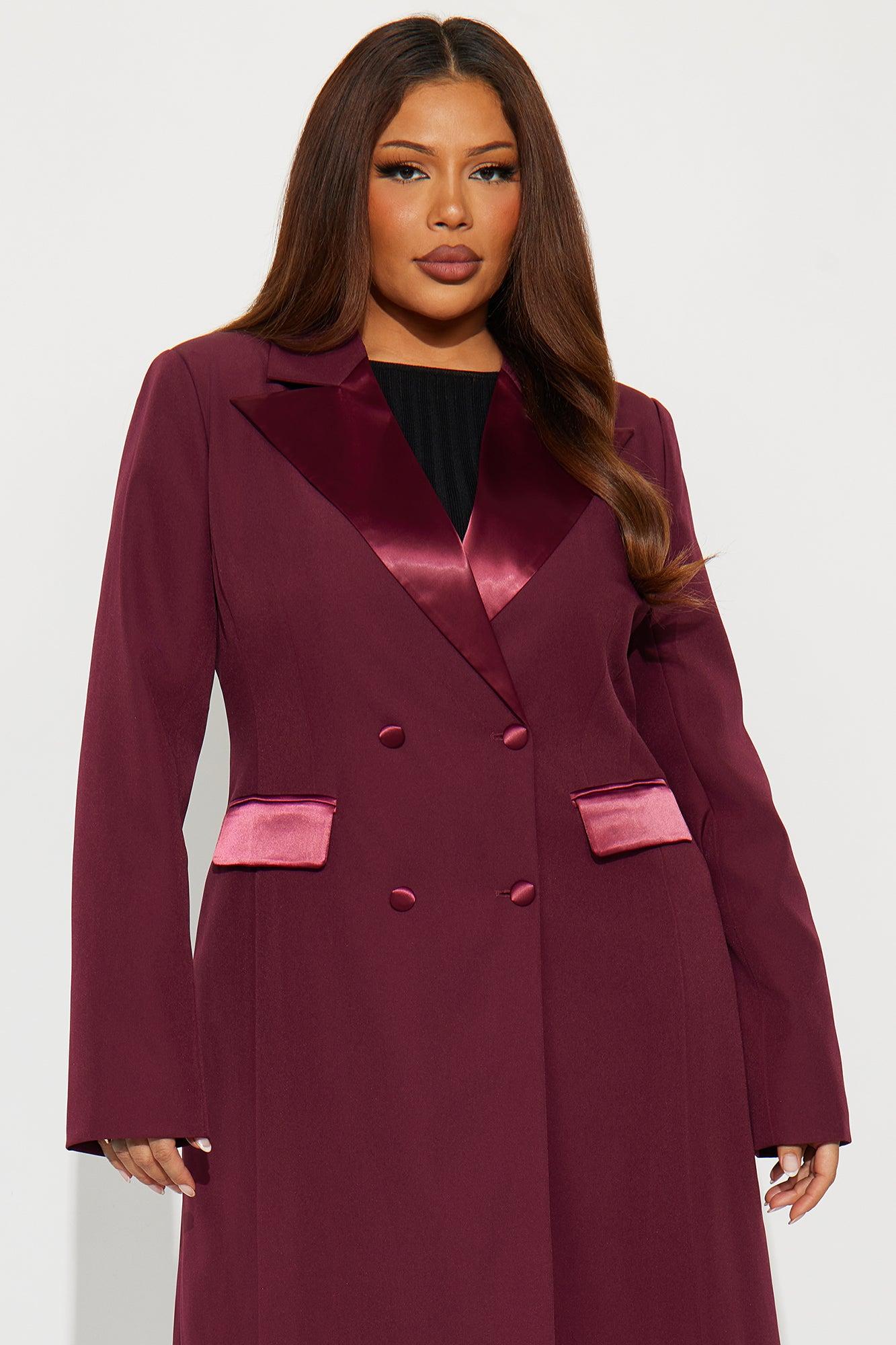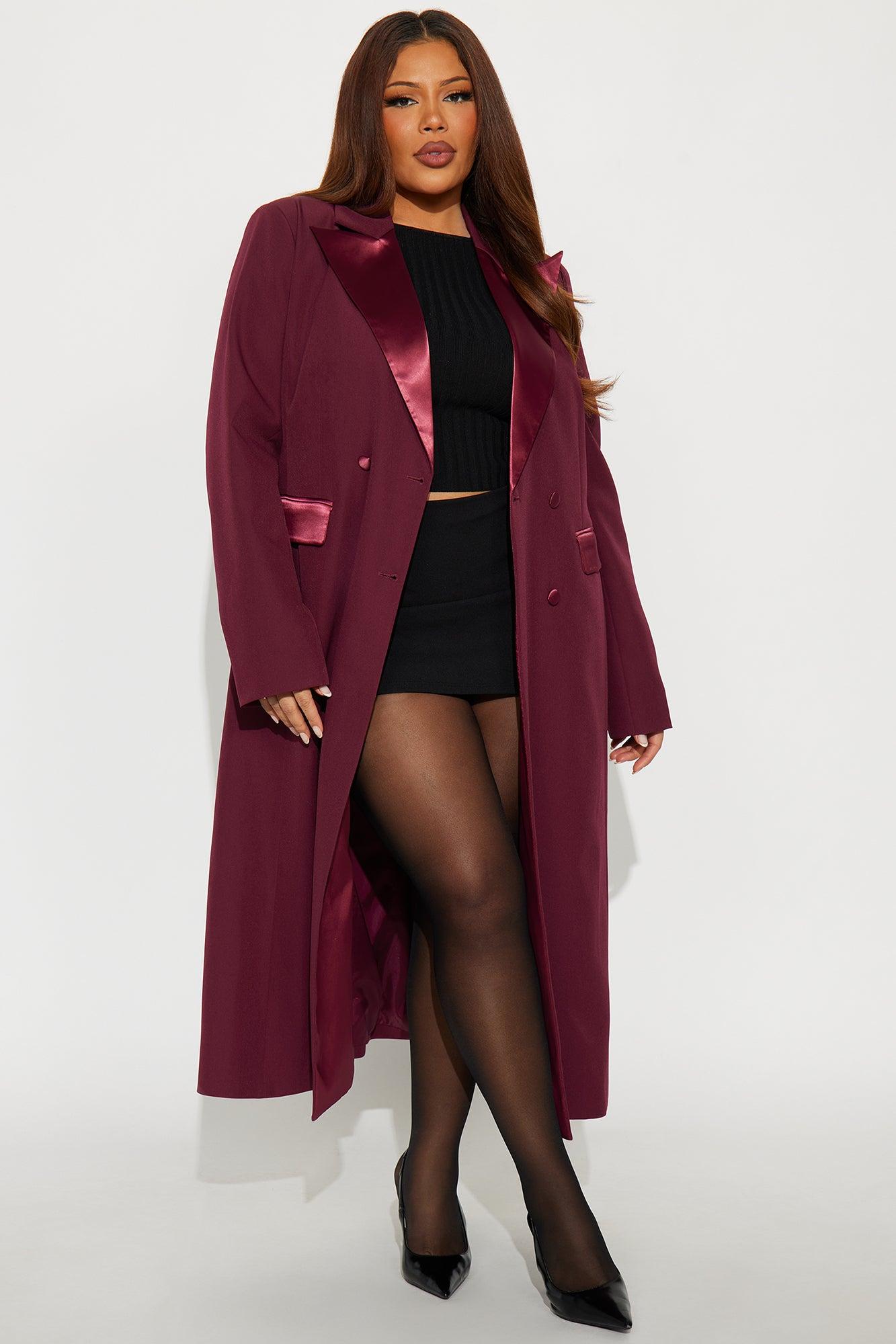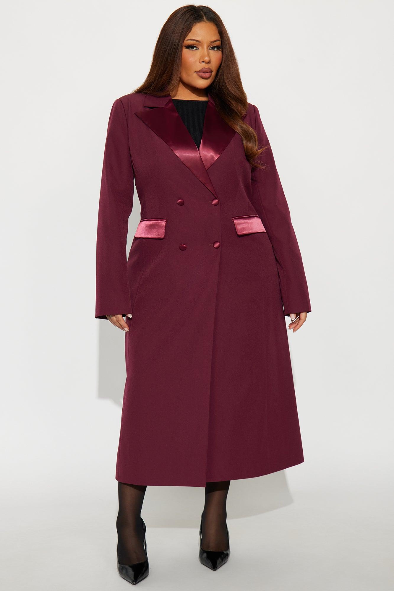 Available In Black And Burgundy. Coat Collar Neckline Long Sleeves Shoulder Pads Double Breasted Satin Contrast Pockets Fully Lined Self: 96% Polyester 4% Spandex Contrast: 92% Polyester 8% Spandex Lining: 100% Polyester Imported California Proposition 65WARNING: Cancer and Reproductive Harm - www.P65Warnings.ca.gov.