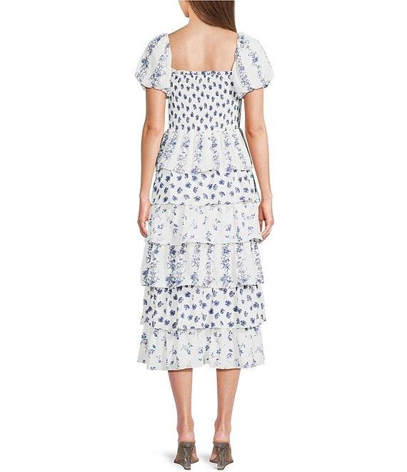 Midnight Doll Floral Print Short Puff Sleeve Tiered Ruffle Midi Dress