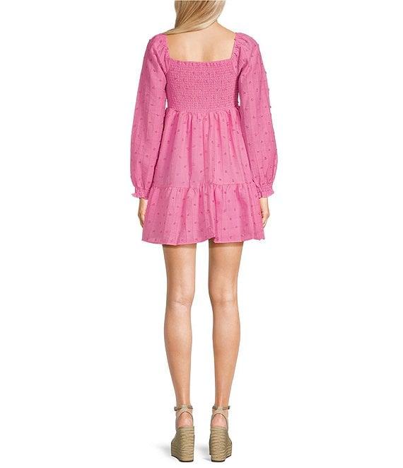 From Midnight Doll , this dress features: V-neck Long sleeves Texture clip dot woven pattern Pullover A-lined silhouette 33 1/2" from center back neck to hem Polyester/nylon Hand wash/lay flat to dry Imported