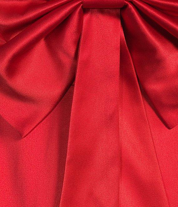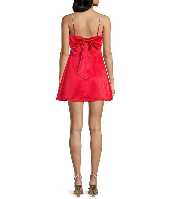 From Midnight Doll, this dress features: Satin fabric Square neckline Sleeveless Rhinestone adjustable spaghetti straps Bow back A-line skirt Zip back closure 33" length from center-back neck Polyester/spandex; lined Machine wash/line dry Imported.
