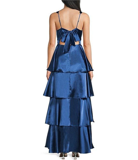 Midnight Doll Satin Sweetheart Neck Tiered Ruffle Long Dress