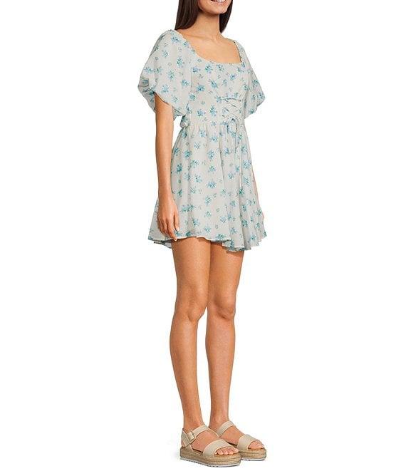 Midnight Doll Square Neck Short Bubble Sleeve Tie Front Skater Dress