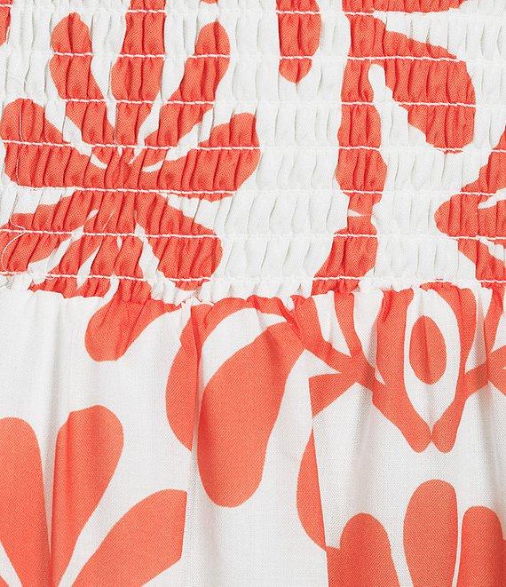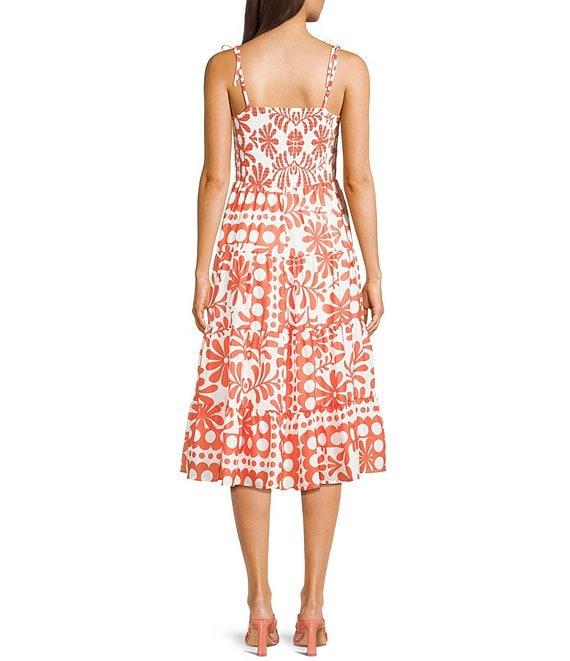 From Midnight Doll, this dress features: Tropical floral print Square neckline Sleeveless Tie-accented shoulder straps Smocked bodice Full, pleated, tiered midi skirt with ruffled, flounce hem Pullover styling 47" length from center-back neck Self and lining of polyester lawn Hand wash/lay flat to dry Imported.