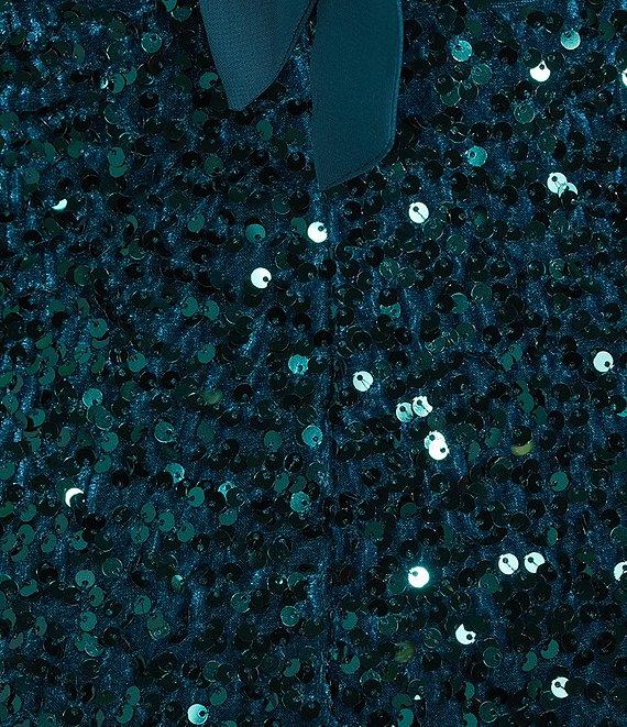 From Midnight Doll, this dress features: Sequin-embellished velvet fabric V-neckline Sleeveless Chiffon tie back Front slit Pullover styling 33.5" length from center-back neck Self of polyester/spandex; contrast and lining of polyester Hand wash/lay flat to dry Imported.