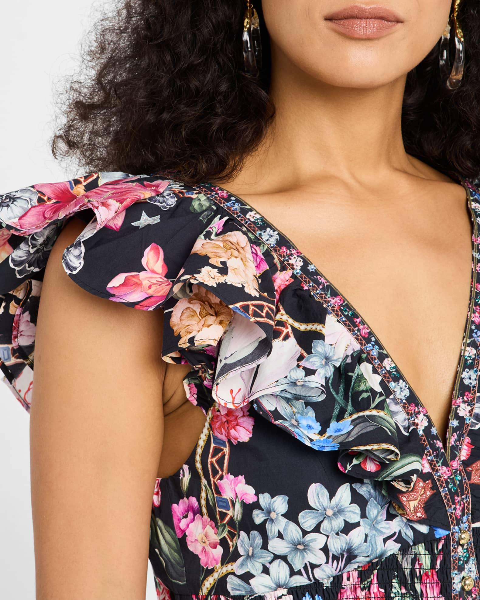 Camilla lovingly handcrafted blouse featured in Midnight in Monserrate print with crystal embellishments V neckline; partial button front Short flutter sleeves Slim fit Cropped smocked hem Mid-back self-ties Organic cotton Imported