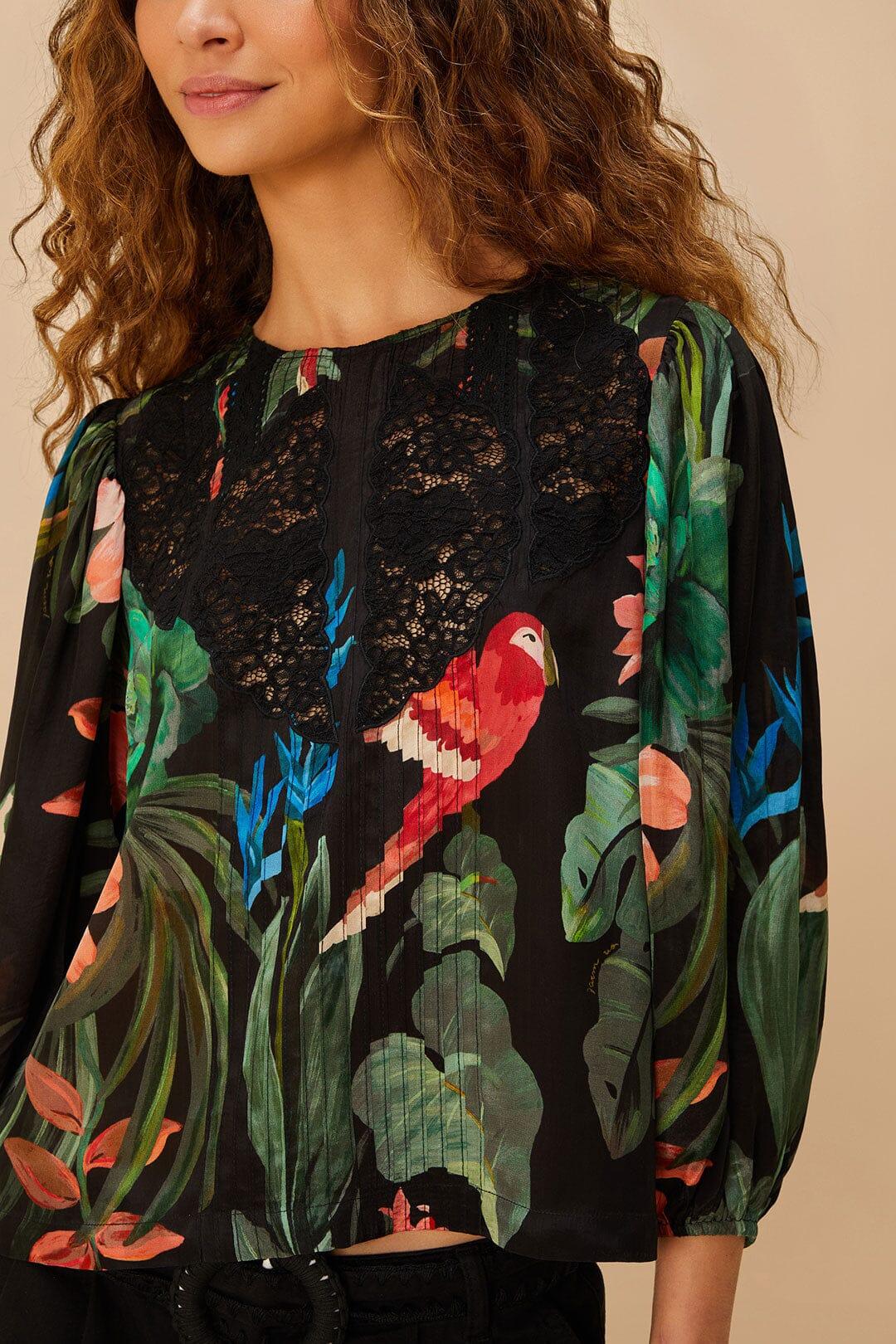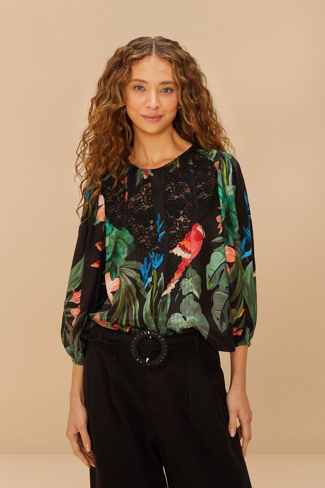 Embrace the vibrant allure of the Midnight Macaw Fiesta Black Blouse by FARM Rio, where exotic fauna meets exquisite craftsmanship. This stunning piece boasts a mesmerizing macaw pattern, painted in deep blues and pops of rich, tropical hues against a black backdrop. Its flattering round neckline and fluid silhouette create a harmonious blend of elegance and whimsy, perfect for any occasion. Embrace the spirit of Brazilian flair with every wear.Composition 100%VISCOSECare Instructions MACHINE WASH GENTLE CYCLE, DO NOT BLEACH, DO NOT TUMBLE DRY, LINE DRY, LOW IRON, DO NOT DRY CLEANSize and Fit Inches XXS XS S M L XL Bust 33 3/4 35 3/4 37 3/4 39 3/4 43 46 Waist N/A N/A N/A N/A N/A N/A Length 21 3/4 22 1/4 22 3/4 23 2/4 24 24 2/4 Hip 44 46 48 50 56 1/4 56 1/4