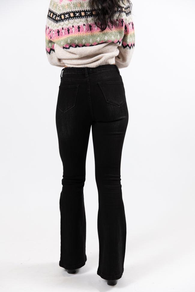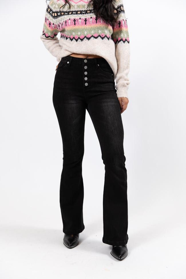 Details Black Wash Flares Fabric is stretchy Button up closures, pockets Pair these jeans with a sweater and boots! Unlined Size 25 inseam: 28" Material and Care 87% cotton 11.5% polyester 1.5% spandex Cold gentle machine wash, hang to dry Patterns may vary Materials may have natural variations Colors may vary from different viewing devices.
