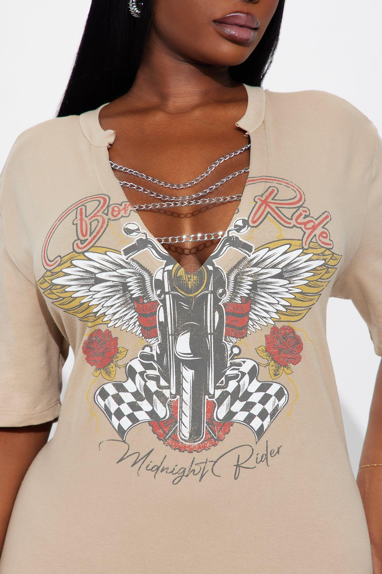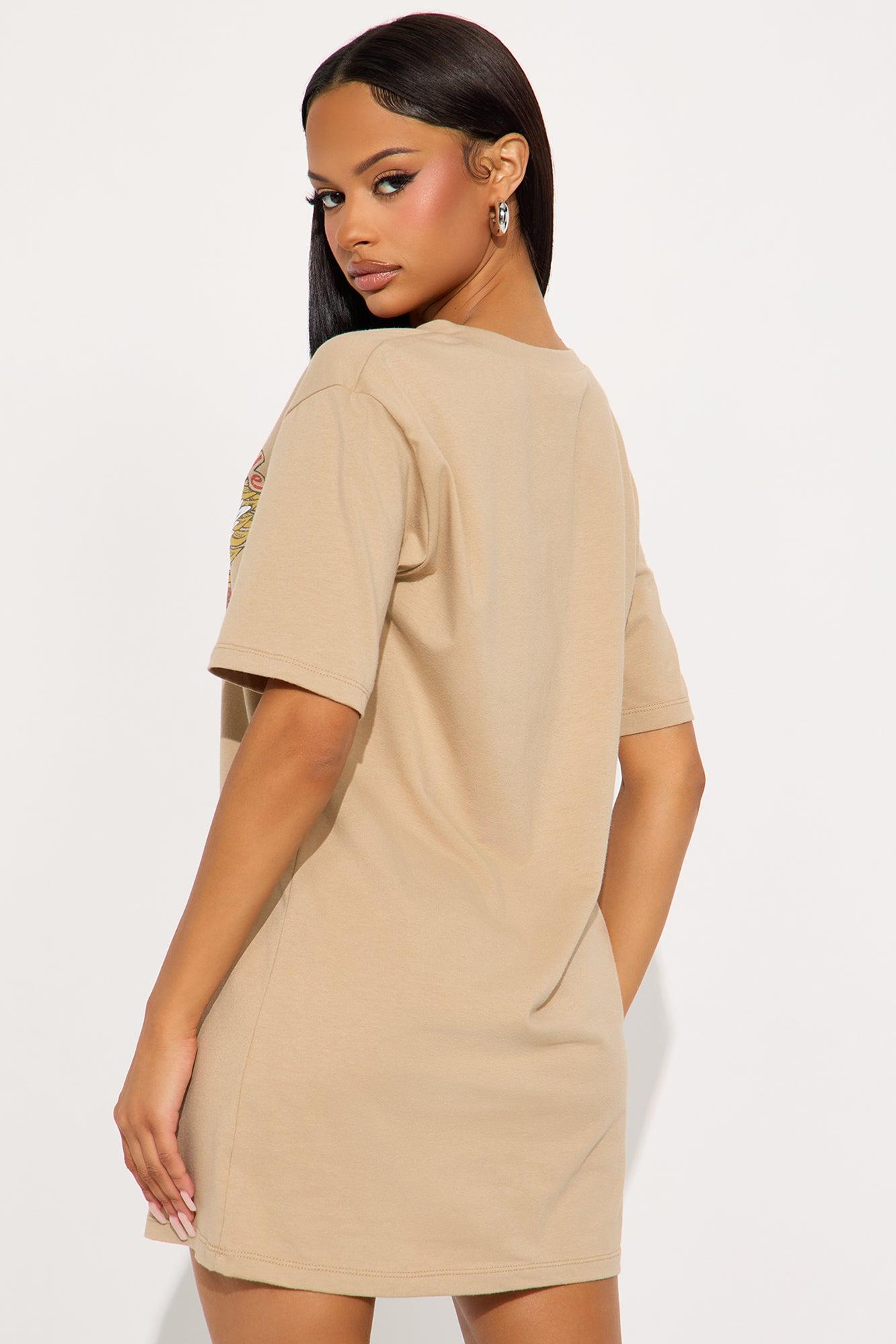 Available In Beige. T-Shirt Mini Dress Deep V-Neckline Short Sleeve Hardware Front Screen Stretch Length Measured Flat = 32" Disclaimer: Due To The Printing Process A Difference In Saturation May Occur. Each Garment Is Unique. 95% Cotton 5% Spandex Imported