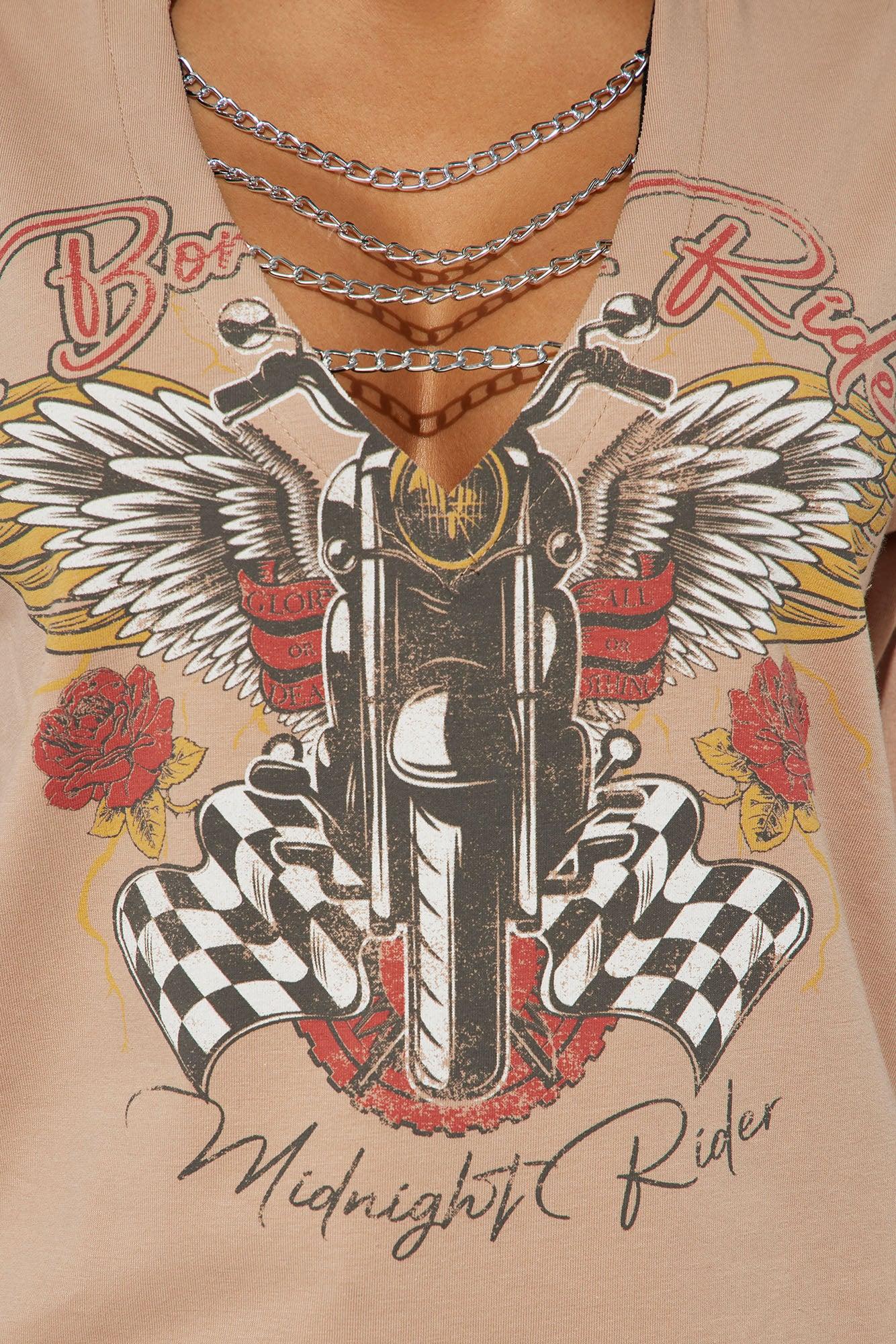 Available In Beige. T-shirt Deep V-Neck Short Sleeve Chain Detail Front Screen Loose Fit Disclaimer: Due To The Printing Process A Difference In Saturation May Occur. Each Garment Is Unique. 95% Cotton 5% Spandex Imported