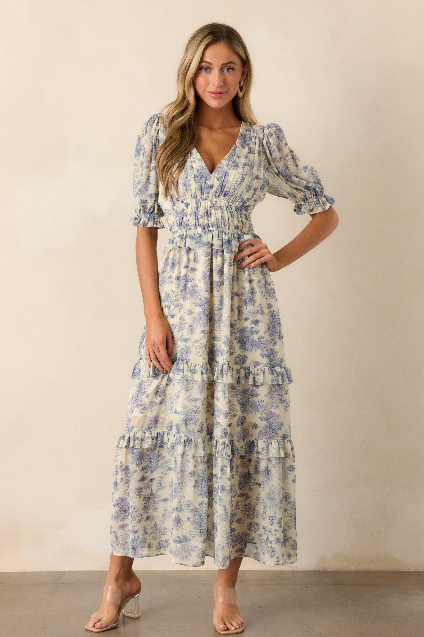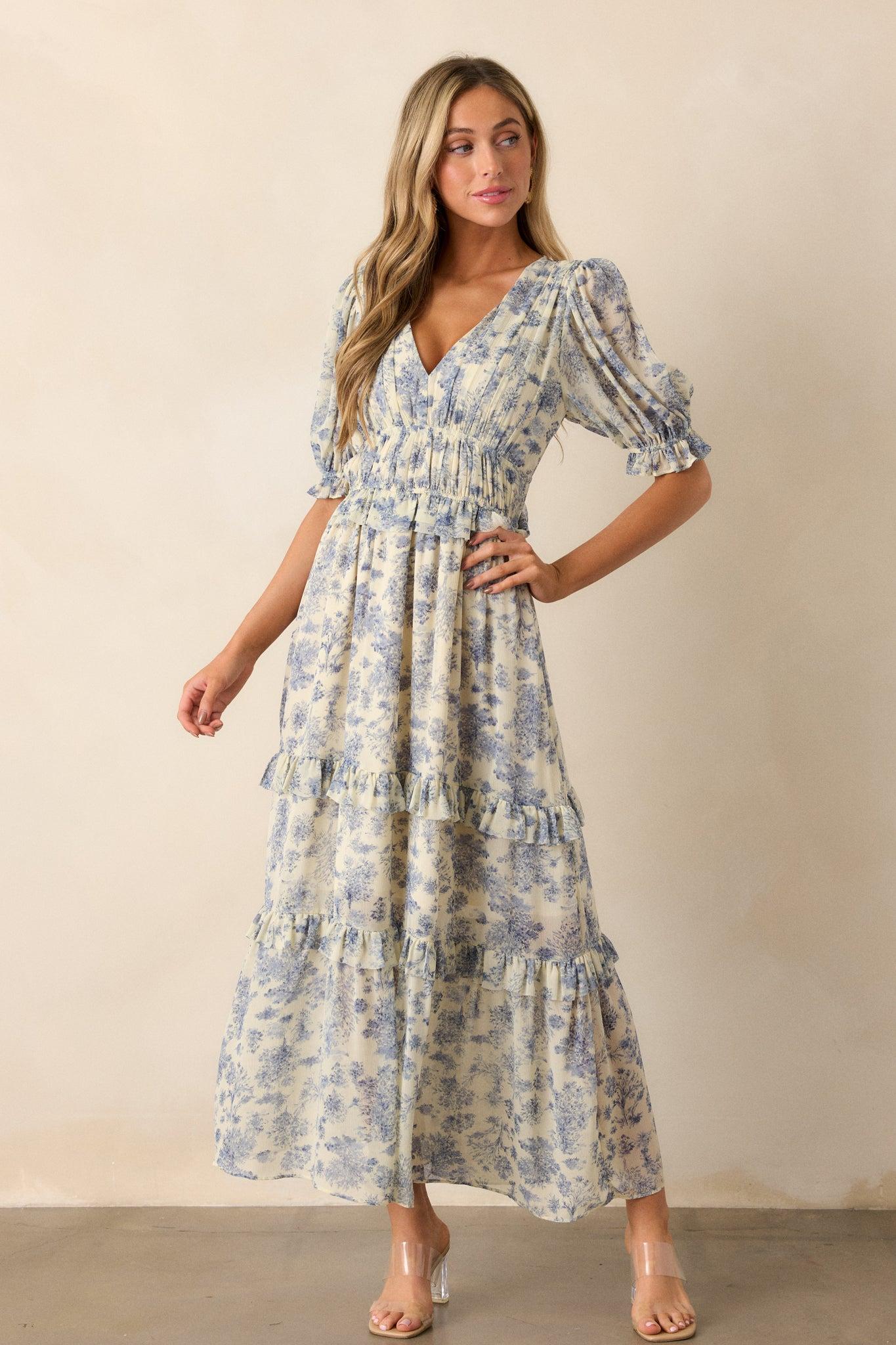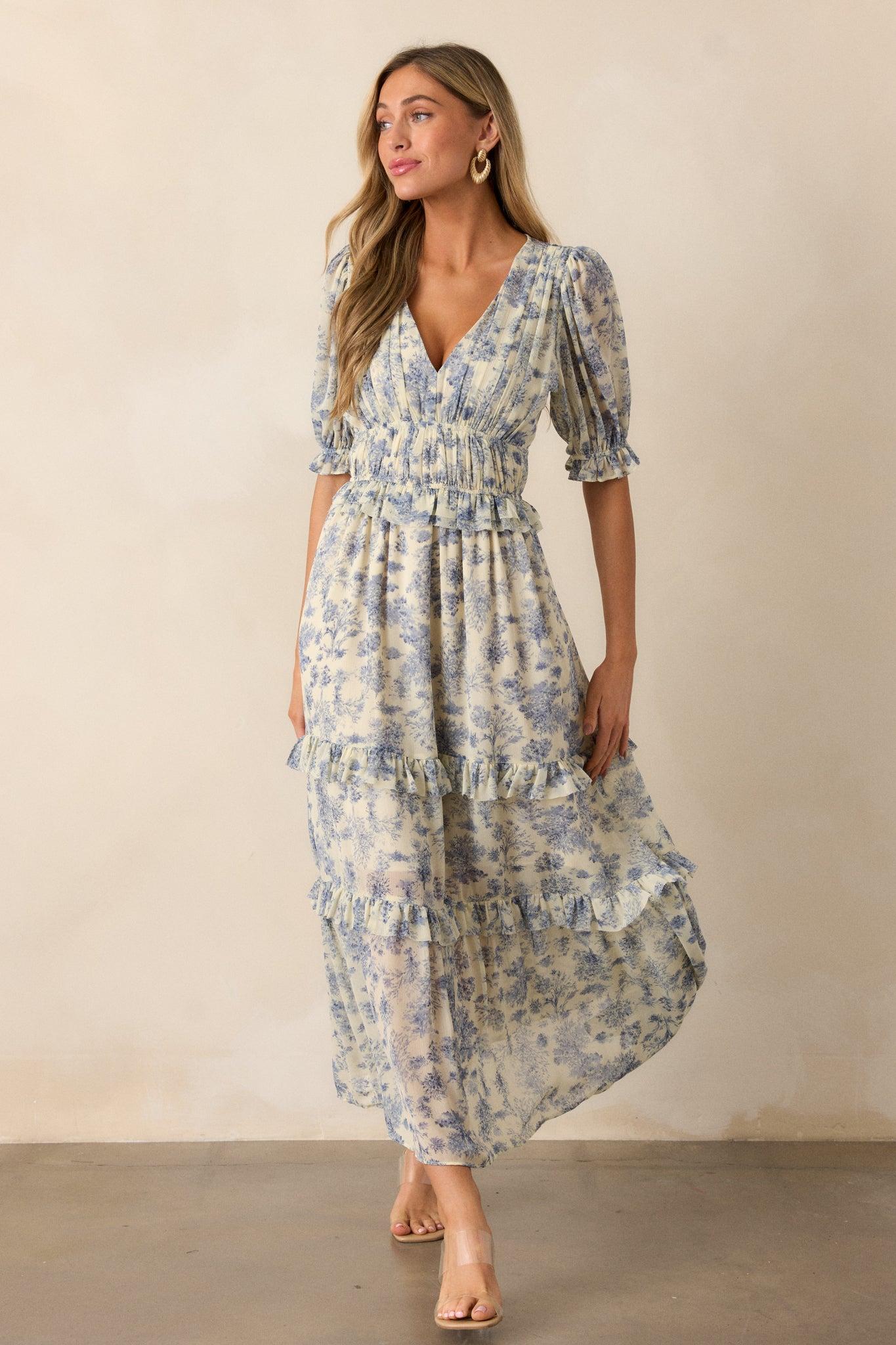 Unleash your inner fashionista with the Midnight Train Blue Floral Midi Dress. This beautiful dress features a stunning floral design and a comfortable midi length, perfect for any occasion. Elevate your style and feel confident in this must-have dress that will make you stand out from the crowd. This blue dress features a v-neckline, two thin elastic waist bands, a tiered design, ruffled trim on the tiers, a blue floral design, a midi length and half length puff sleeves with elastic cuffs.