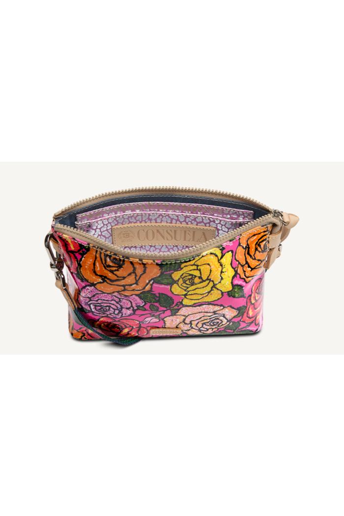 Includes detachable and adjustable woven crossbody strap