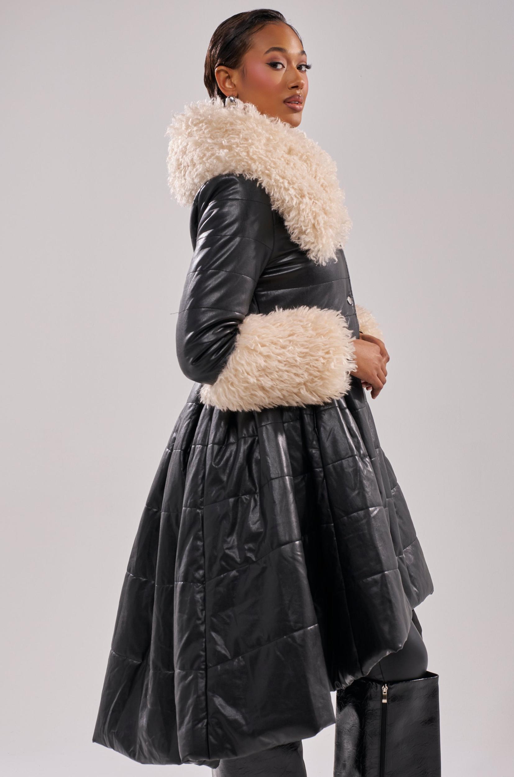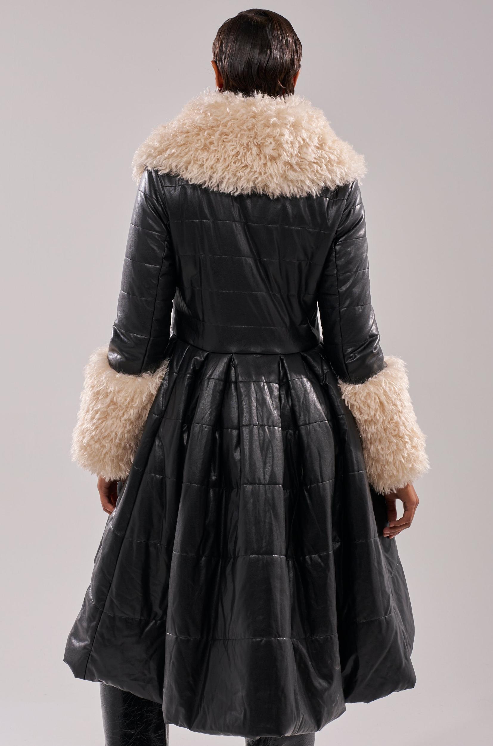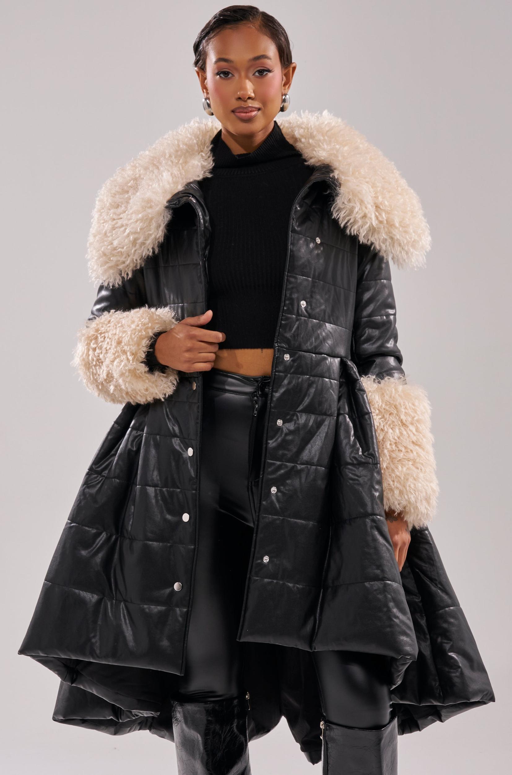 Winter-chic is easy to achieve in The AKIRA Label Midtown Peplum Puffer In Faux Leather. This elevated jacket is crafted from a padded, faux leather puffer base with ultra-fluffy, faux fur trim detailing including on the oversized collar and sleeve cuffs. It features a non-removable fur collar, long sleeves, snap-button front closures, and a sculpted waist that flows into an A-line hemline. Complete with a longline silhouette. - Shell 1: 100% PU, Shell 2: 100% Polyester, Padding: 100% Polyester, Lining: 100% Polyester- Dry Clean Only- No Stretch- Imported (all measurements approximate from size small)- 38” Shoulder to Hem- 16” Shoulder to Shoulder- 24” Sleeves- Model is 5’9” and is wearing size smallProduct ID: 1076620 (all measurements approximate from size 1X)- 40” Shoulder to Hem- 18” Shoulder to Shoulder- 26” SleevesProduct ID: 1076624