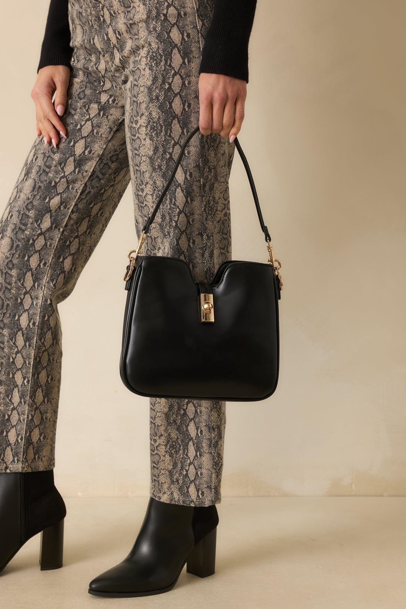 The Might Surprise You Black Faux Leather Twist Lock Handbag brings unexpected style, a refined finish that elevates your look in an instant. This structured black faux leather bag features an optional shoulder strap, optional adjustable crossbody strap, v-cut top edge, gold turn lock closure, gold hardware, black interior lining, interior slip pocket, and an interior functional zipper pocket. This Bag Measures 9.25" in Length, 2" in Width, & 8.25" in Height 100% Polyurethane Manufactured in China