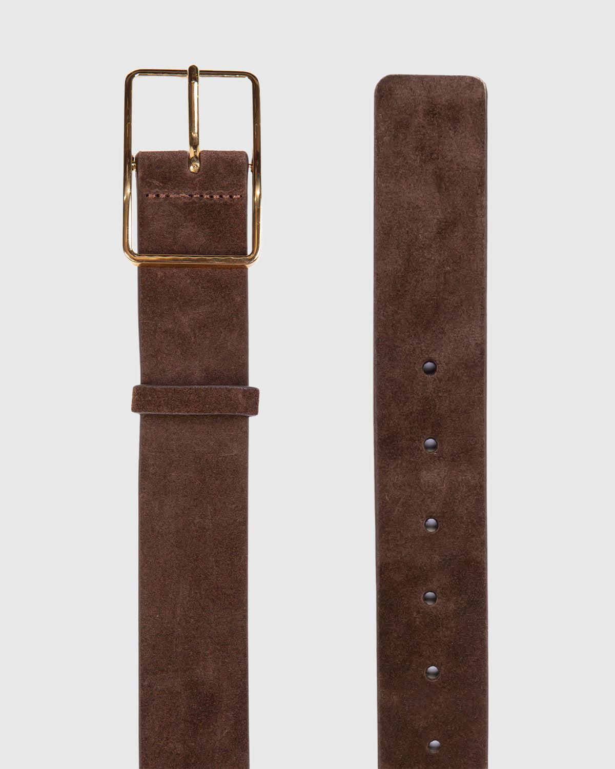 Gold plated brass rectangular shaped buckle. Secured on a brushed kid suede strap.