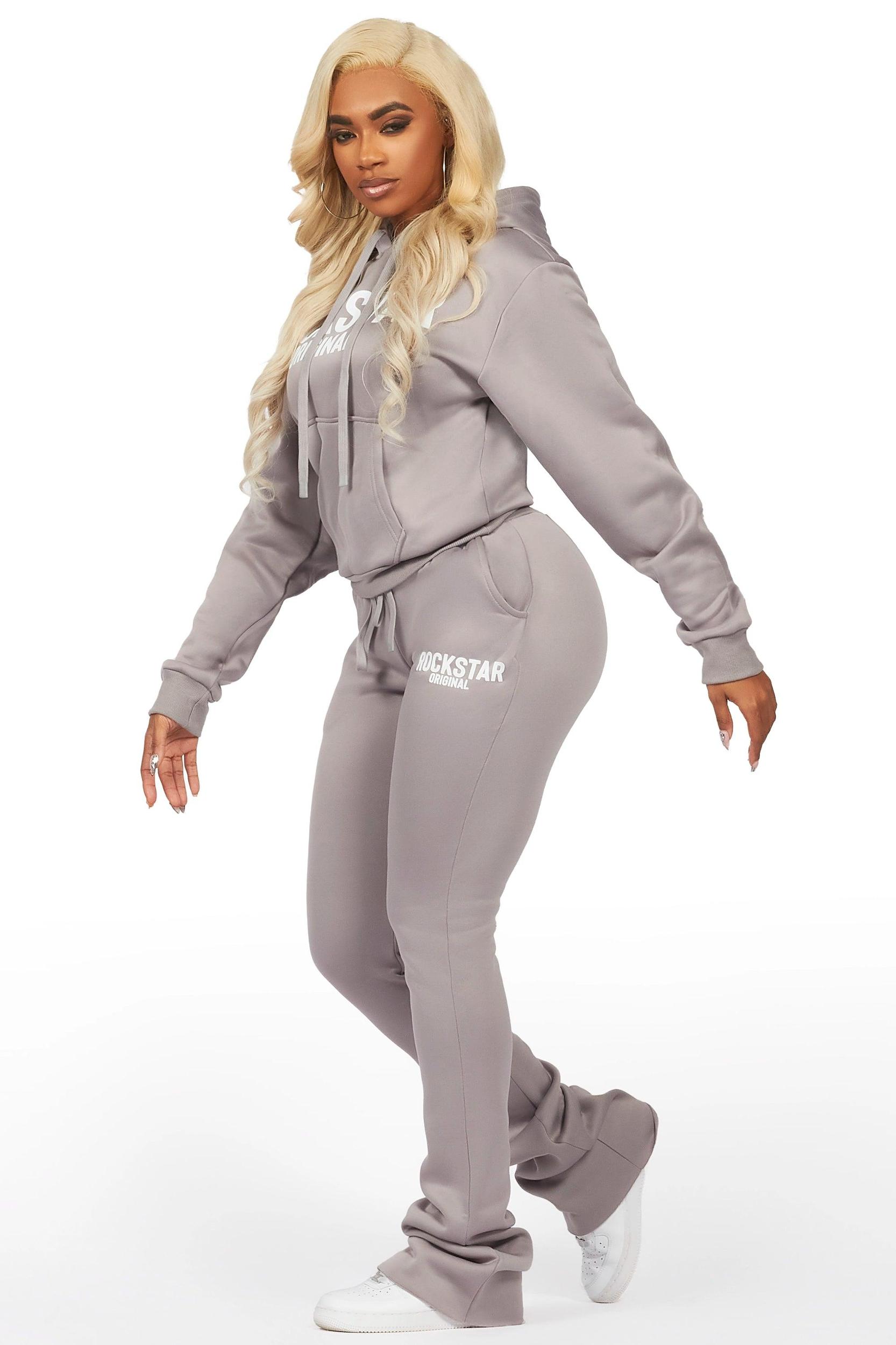 An urban two-piece hoodie and super stacked track pant set for women in grey. Designed with custom detailing and extra long legs for the perfect everyday set. Drawstring hood Ribbed knit trims Kangaroo pocket Printed RSO logos Drawstring waistband Dual slant pockets Super stacked construction Flare leg openings 42" inseam