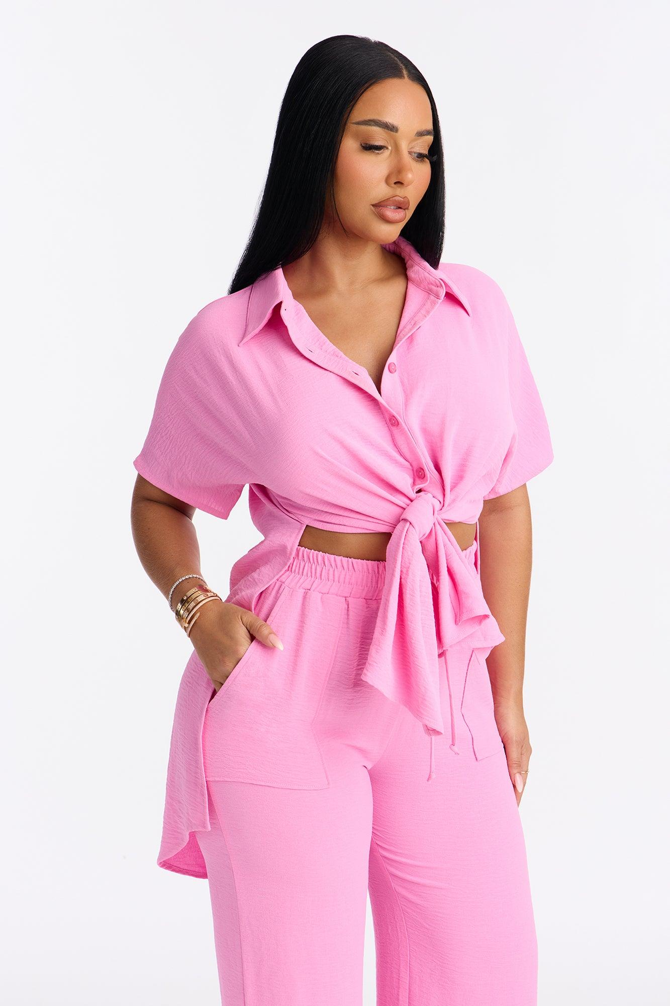 Available In Pink, Sage, White And Yellow. 2 Piece Ensemble Tie Front Top and Wide Leg Pant Set Non-stretch 33" Inseam Elastic Waistband Self: 100% Polyester Imported California Proposition 65WARNING: Cancer and Reproductive Harm - www.P65Warnings.ca.gov.