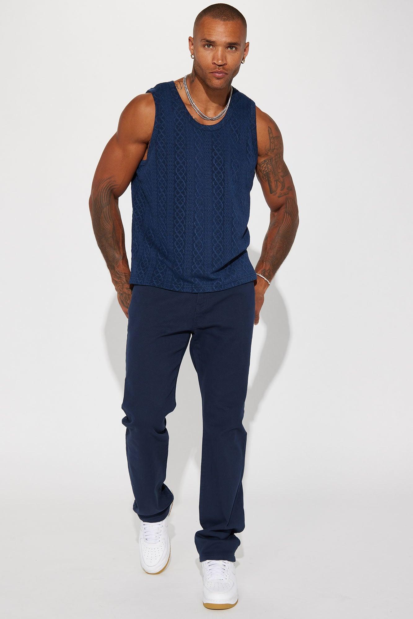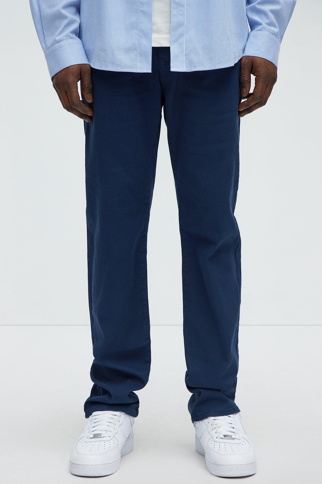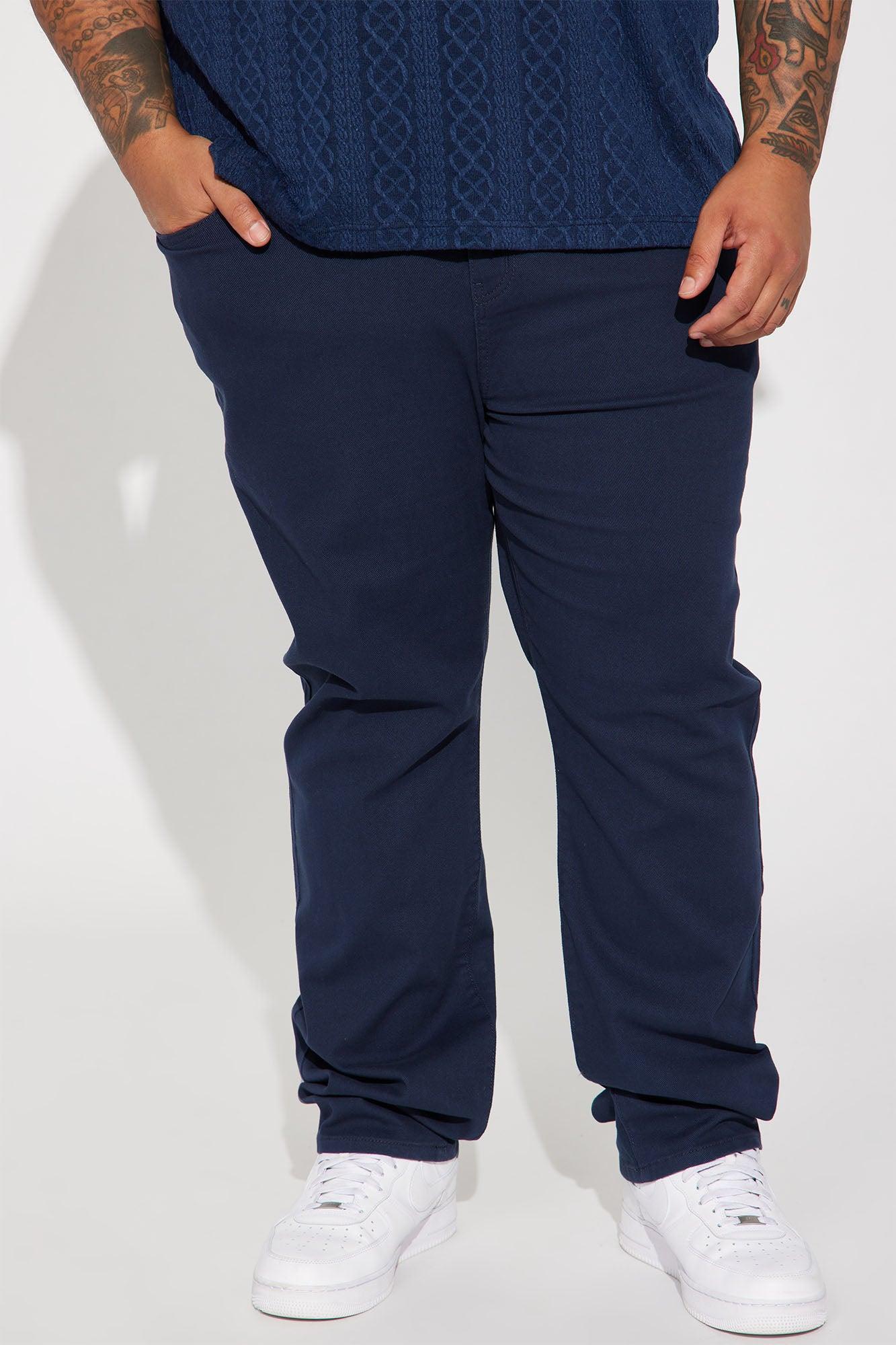 Available In Navy. Stretch Denim Straight Fit 5 Pocket Style Button Closure Zip Fly Clean Finish 98% Cotton 2% Spandex Imported California Proposition 65 WARNING: Cancer and Reproductive Harm - www.P65Warnings.ca.gov.