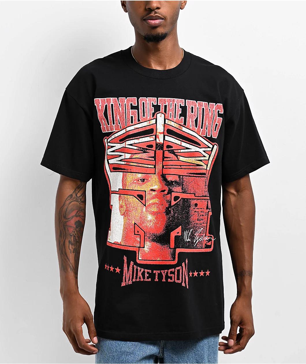 Represent the King of the Ring in the Portrait black t-shirt from Mike Tyson. The chest graphic features the boxing legend's face in red, yellow, and white tones visible through an MT boxing ring logo. Made from pure cotton for comfort, this shirt is