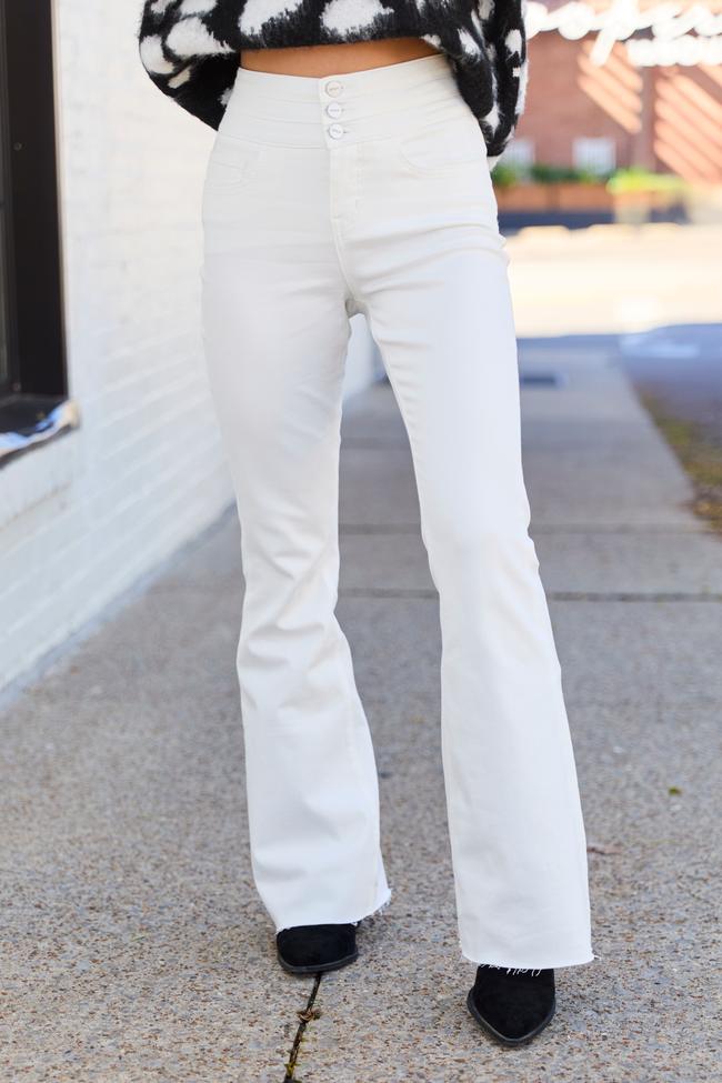 Details Fabric has stretch Three button/ zip fly Flare leg Functional pockets Material and Care 98% cotton 2% spandex Machine wash inside out cold, tumble dry low Size and Fit Size 26 approximate measurements. Waist: 26.25" Hips: 33.5" Length: 43.25" Inseam: 32"