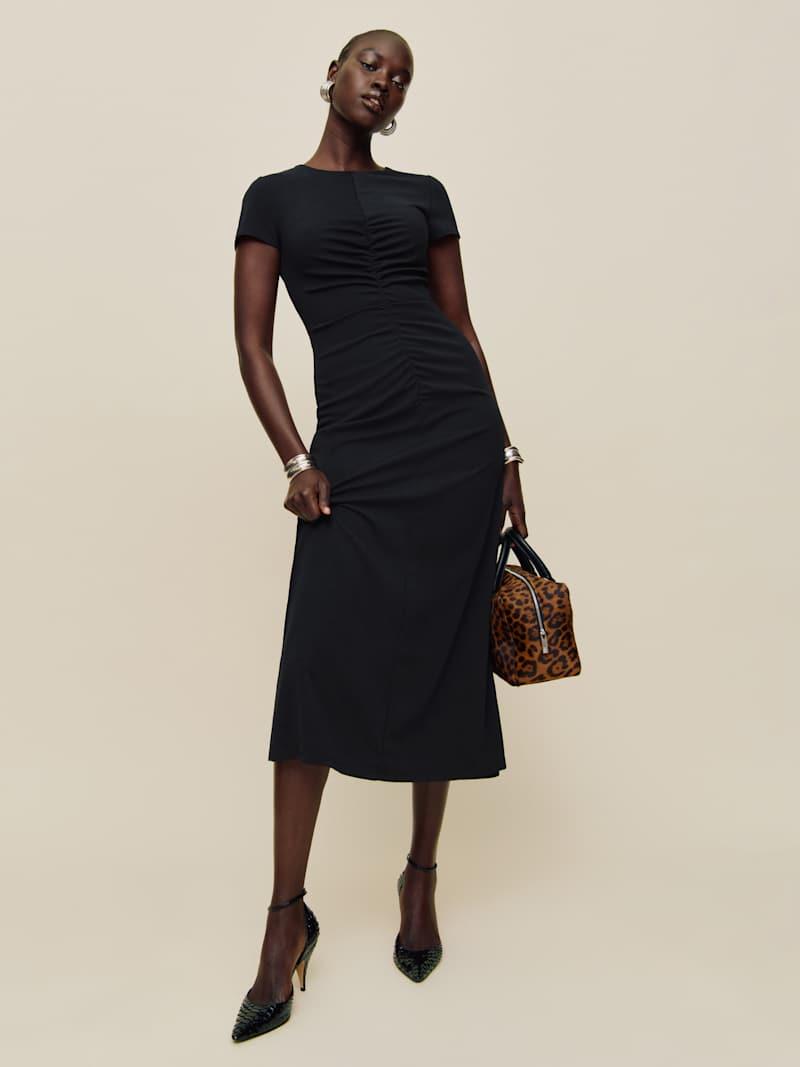 Wear the dress. Shop the Mila Knit Dress from Reformation, a short-sleeved midi dress with ruching throughout.