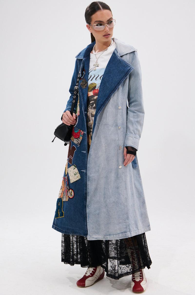 The AKIRA Label Mila Patch Denim Trench is a bold, statement-making coat that fuses vintage charm with streetwear edge, boasting a two-tone denim design. Crafted from structured cotton, this full-length trench is adorned with a striking collage of embroidered patches and appliqués throughout the front. It features a classic wide lapel collar, snap button front, long sleeves with button cuffs, and an adjustable self-tie belt. This worldly piece is perfect for layering, transforming any outfit into a standout ensemble. - Shell: 85% Cotton 15% Polyester- No Stretch- Imported (all measurements approximate from size small)- 46” Shoulder to Hem- 15” Shoulder to Shoulder- 24” Sleeves- Model is 5’9” and is wearing size smallProduct ID: 1040428 (all measurements approximate from size 1X)- 48” Shoulder to Hem- 17” Shoulder to Shoulder- 26” SleevesProduct ID: 1040432