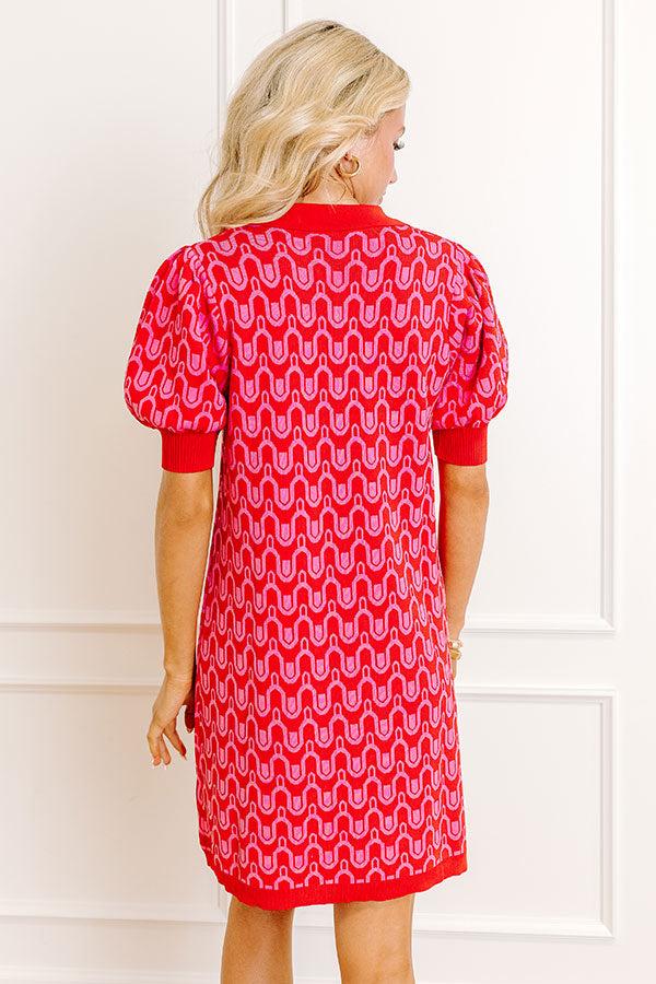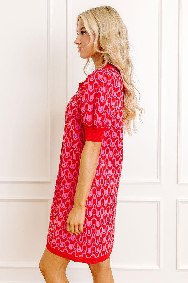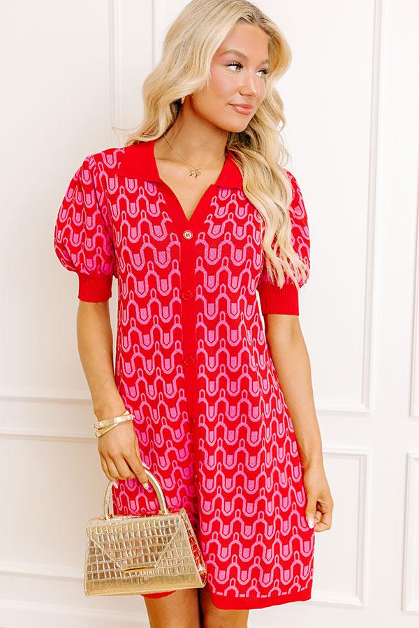 - This adorable mini dress will have you obsessed! With its eye-catching print and a touch of preppy flair, this cutie will get you all the compliments from the cafe to the country club. - Unlined woven material with a pink and red intricate design - A collared v-cut neckline - Short puff sleeves with ribbed cuffs - A faux buttoned front - A relaxed silhouette that ends in a straight, mini dress length hemline