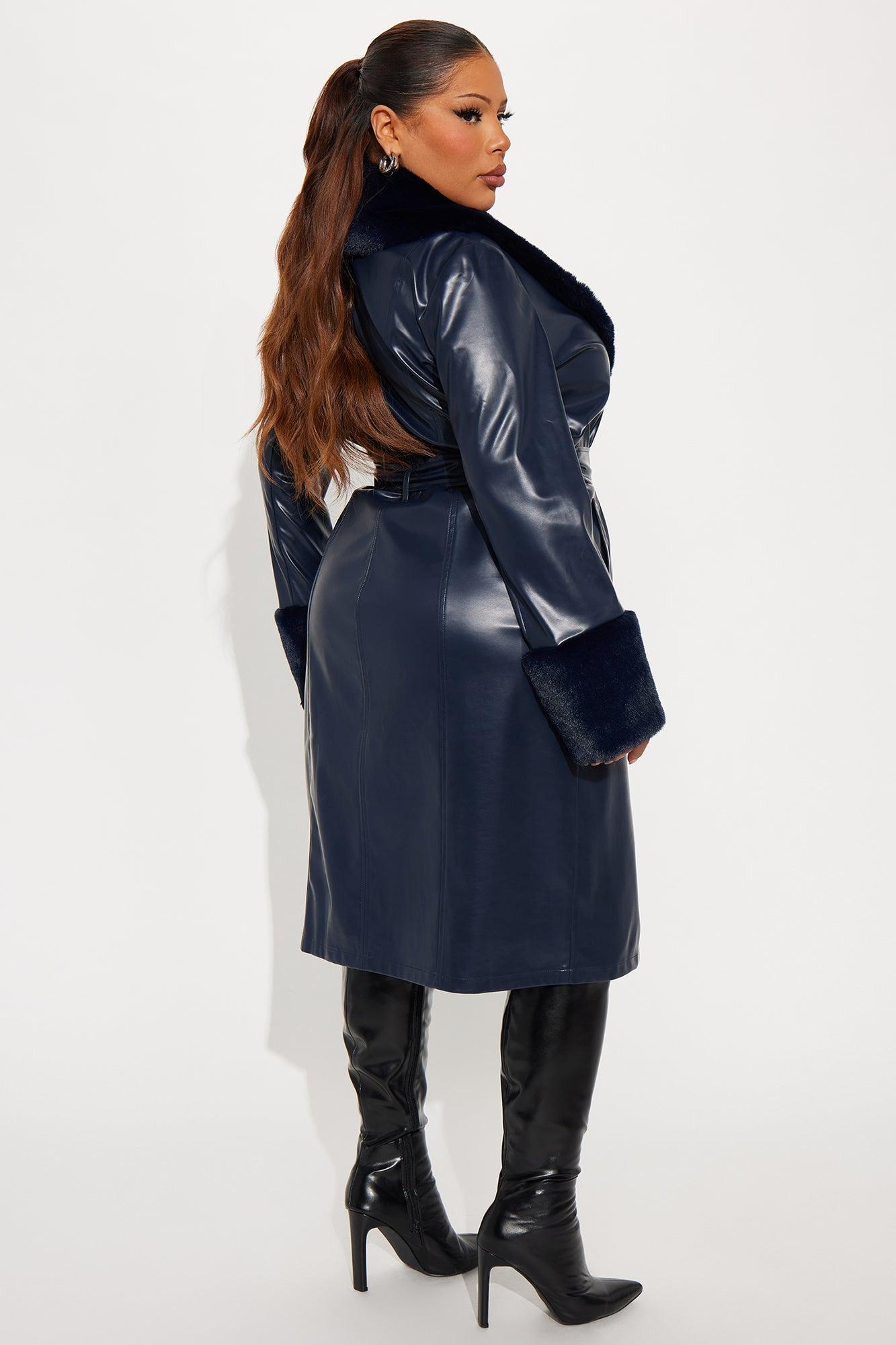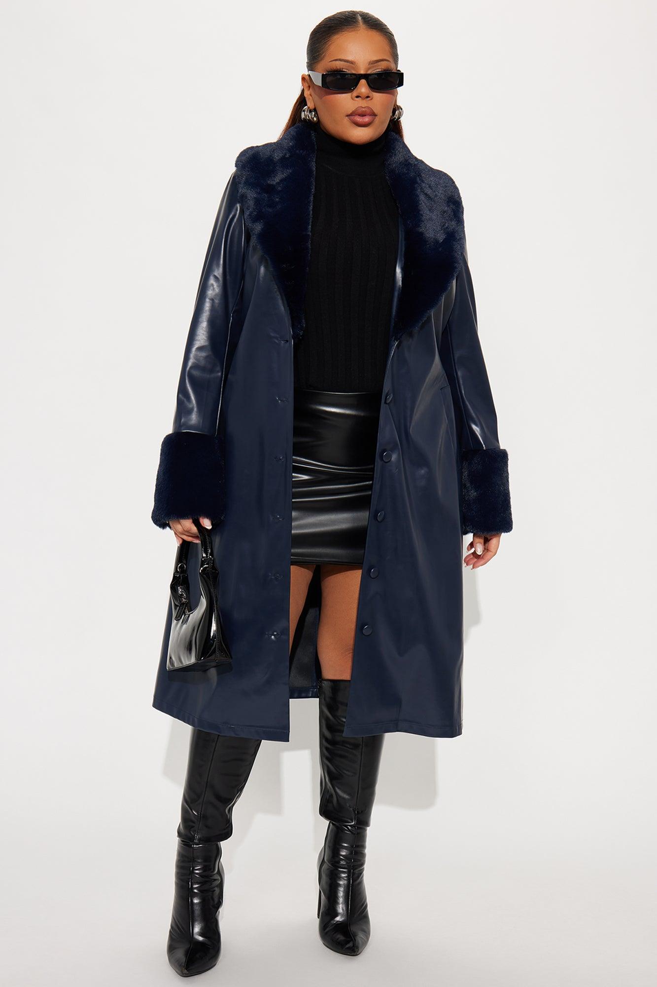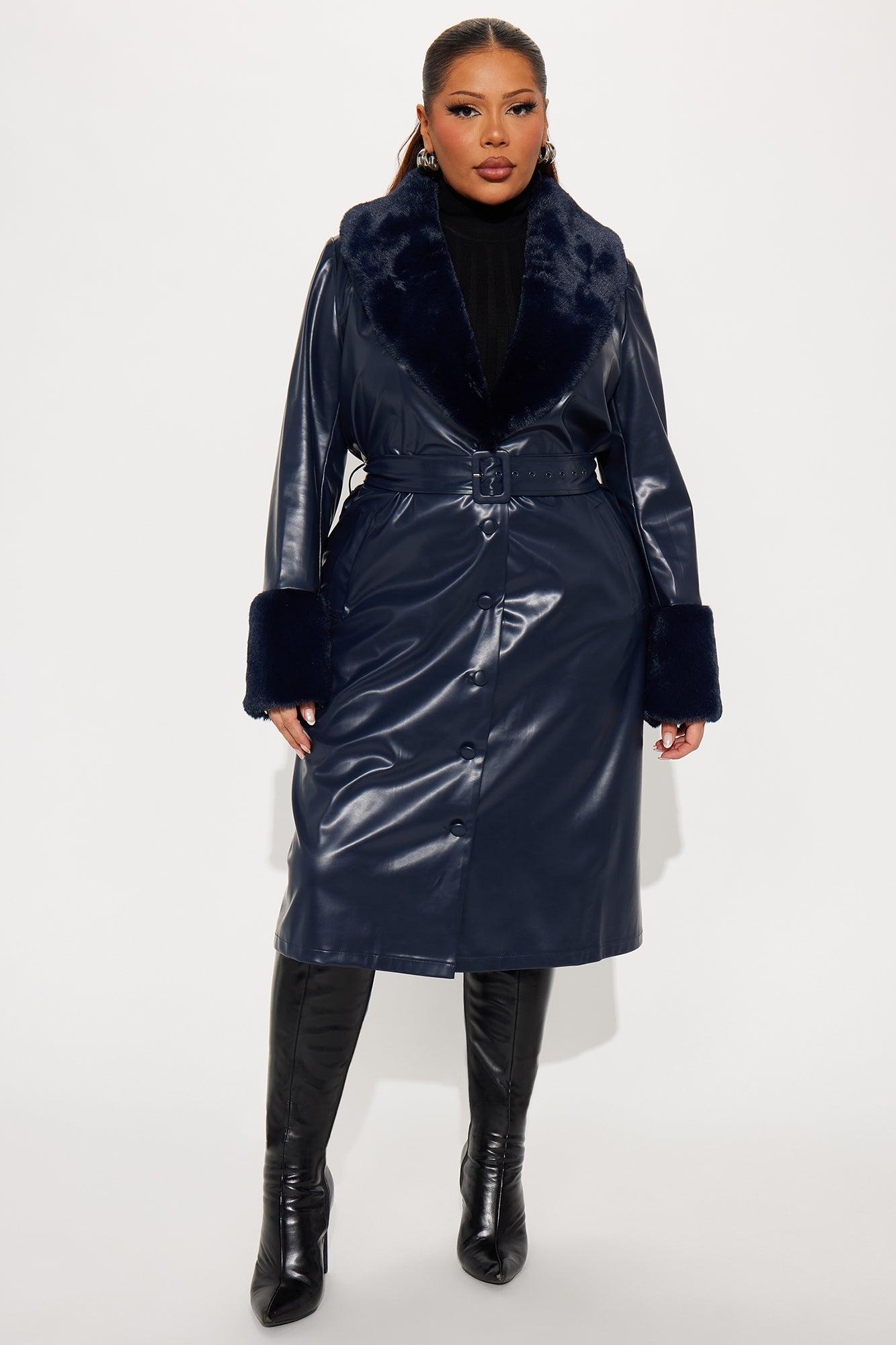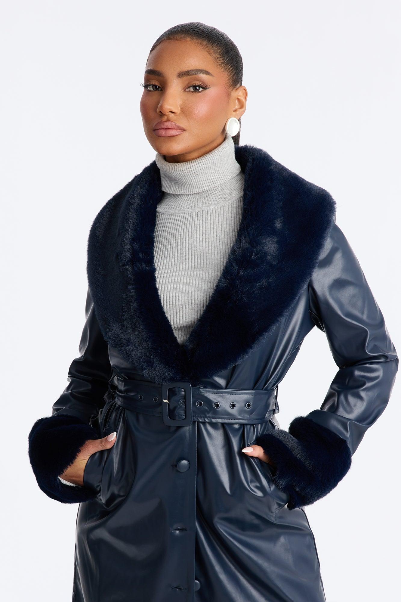 Available In Navy And Raspberry. Faux Leather Coat Faux Fur Collar And Cuffs Long Sleeves Button Closure Belted Slant Pockets Fully Lined Longline Length 50% Polyurethane 50% Polyester Imported California Proposition 65WARNING: Cancer and Reproductive Harm - www.P65Warnings.ca.gov.