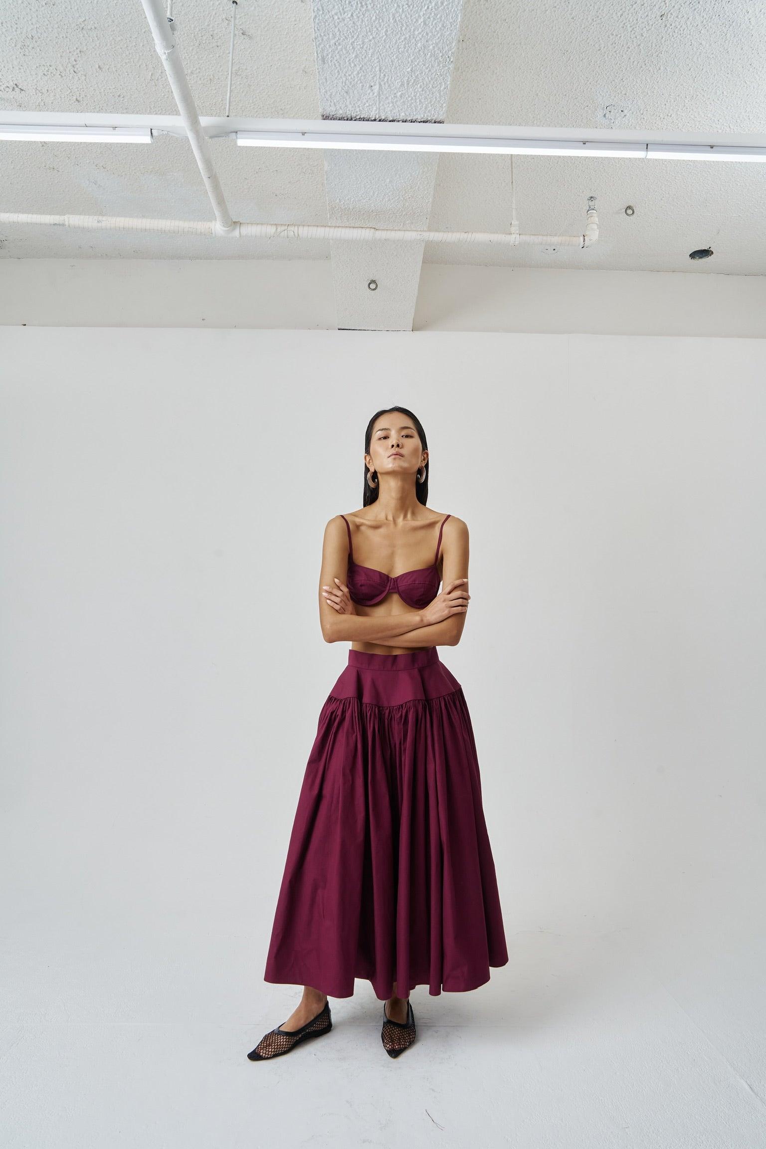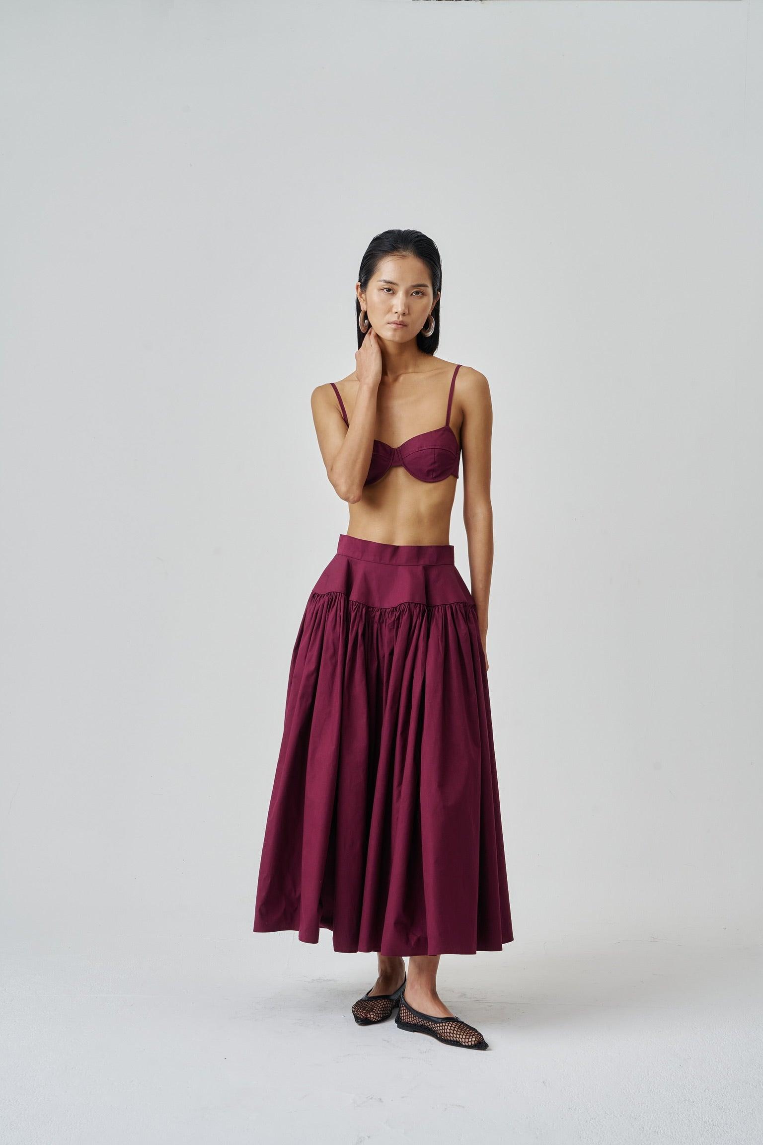 Size: M/LColor: Burgundy Midi Length Structured Basque Waist Pleated DetailingHook-and-Eye and Zipper at the BackSide Pockets100% Cotton MeasurementsLength: 35in / 89cm Waist: 30in / 76cm