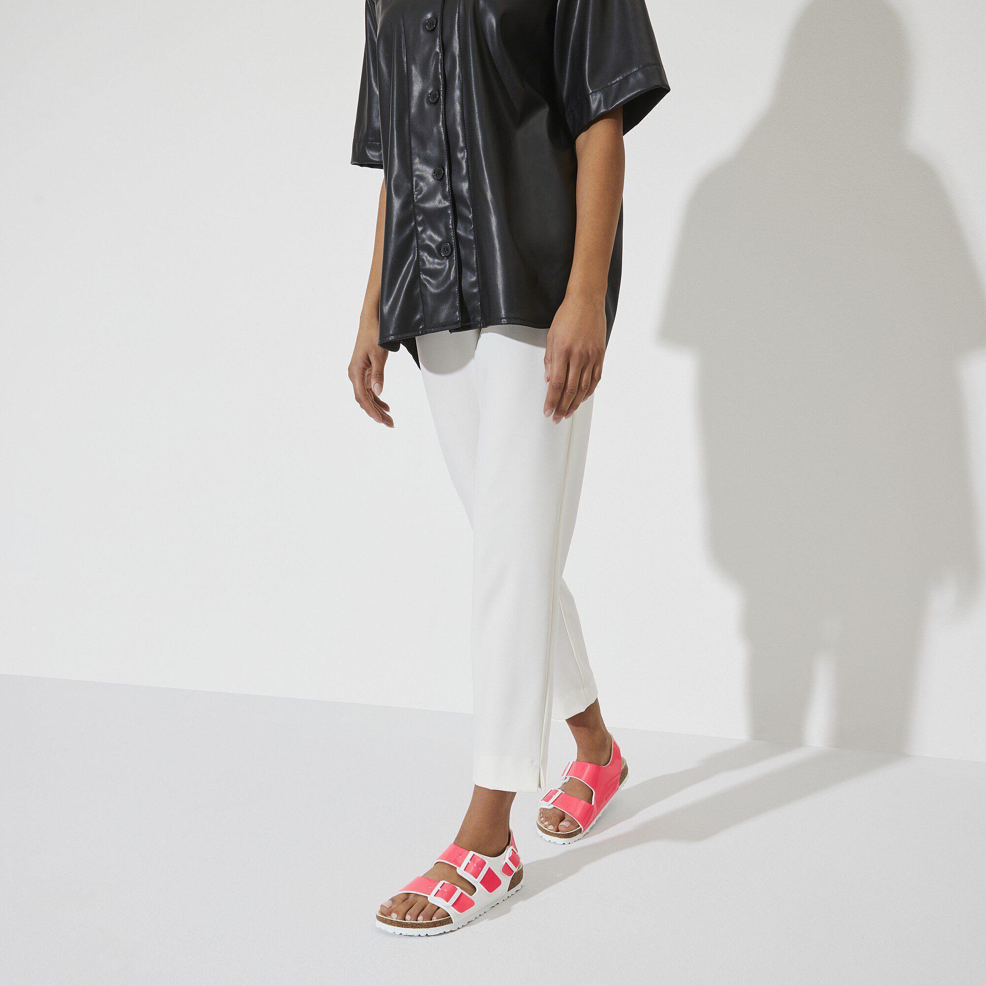 The spotlight's on Milano. A high-shine finish glosses over this bold, street-inspired sandal—made vegan in durable Birko-Flor®. An adjustable backstrap gives you added security and a fit that's just right. Complete with an original BIRKENSTOCK cork-latex footbed that shapes to you for custom support.